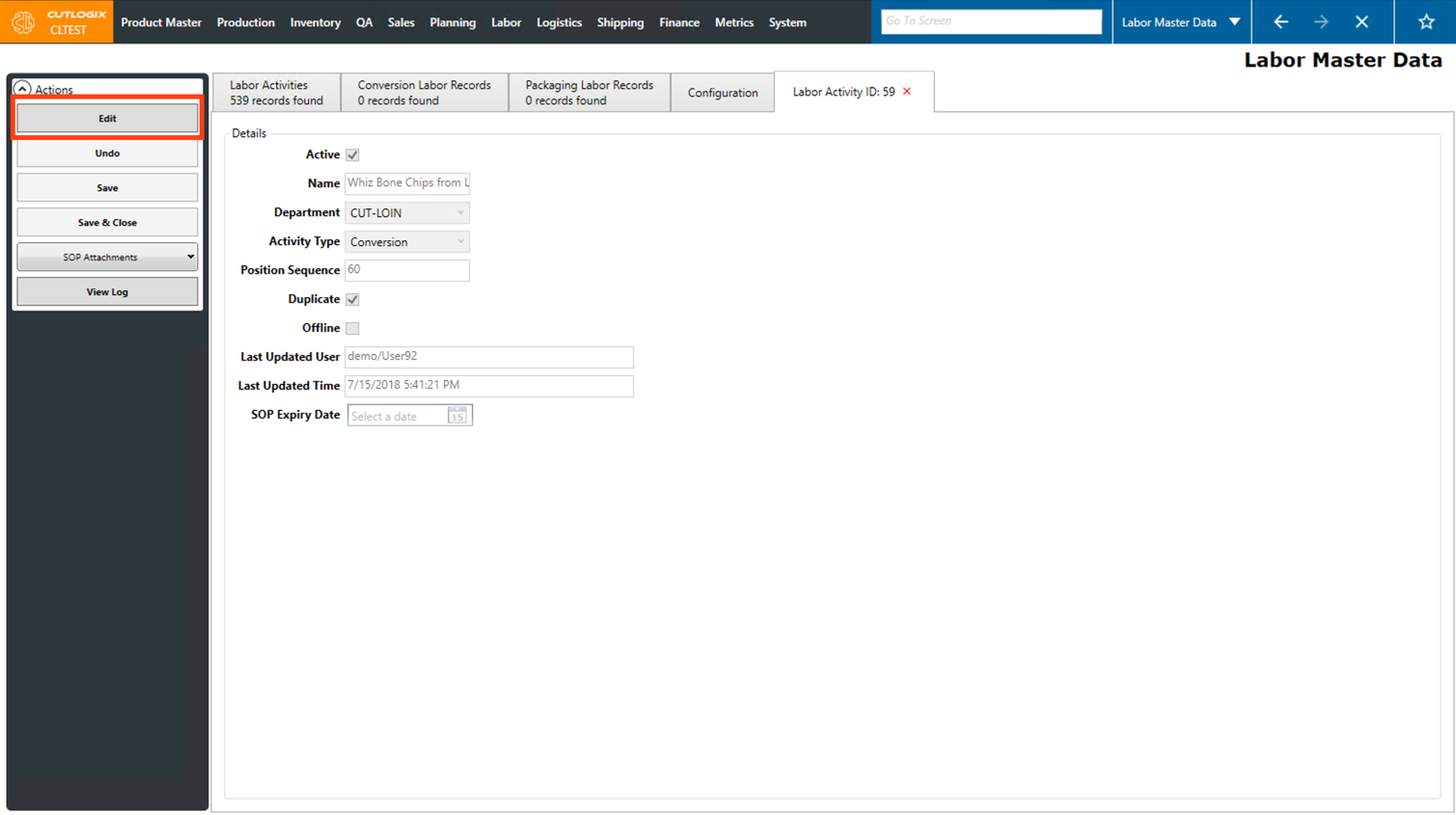 Step 3: A tab will open with the details of the selected labor activity. Click the "Edit" button in the Actions Panel to enable editing.