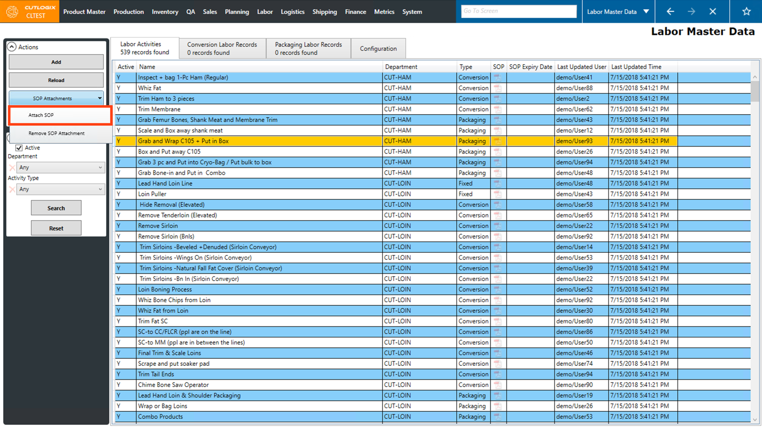 Step 2: Click on the labor activity that you want to attach an SOP to, once selected it will be highlighted in orange. Ensure that it does not already have an SOP attached by confirming the icon in the "SOP" column is a faded color.