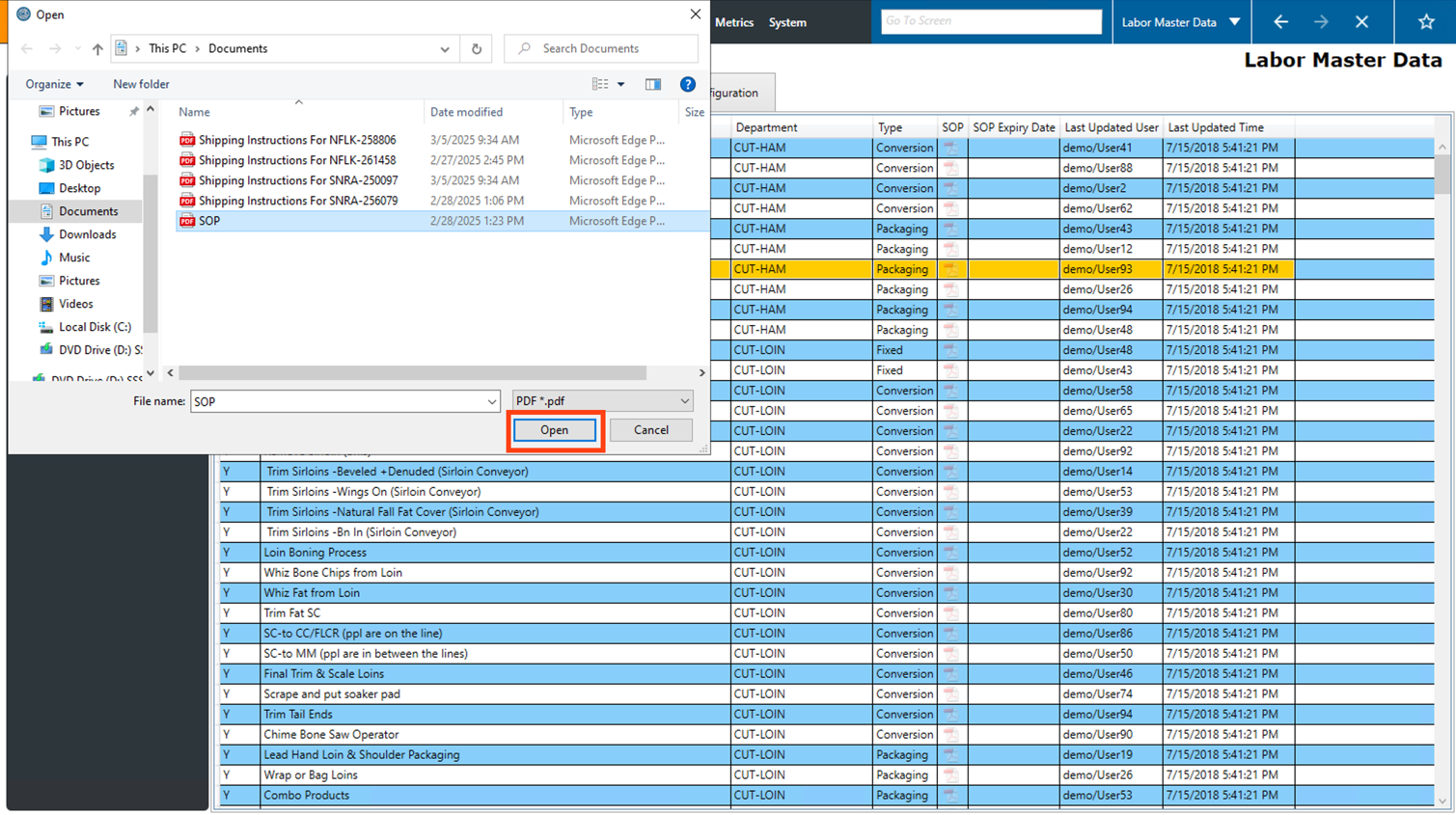 Step 4: Your file explorer will open where you can then choose the PDF file that you want to attach to the labor activity in CutLogix. Click on the file and then click "Open".