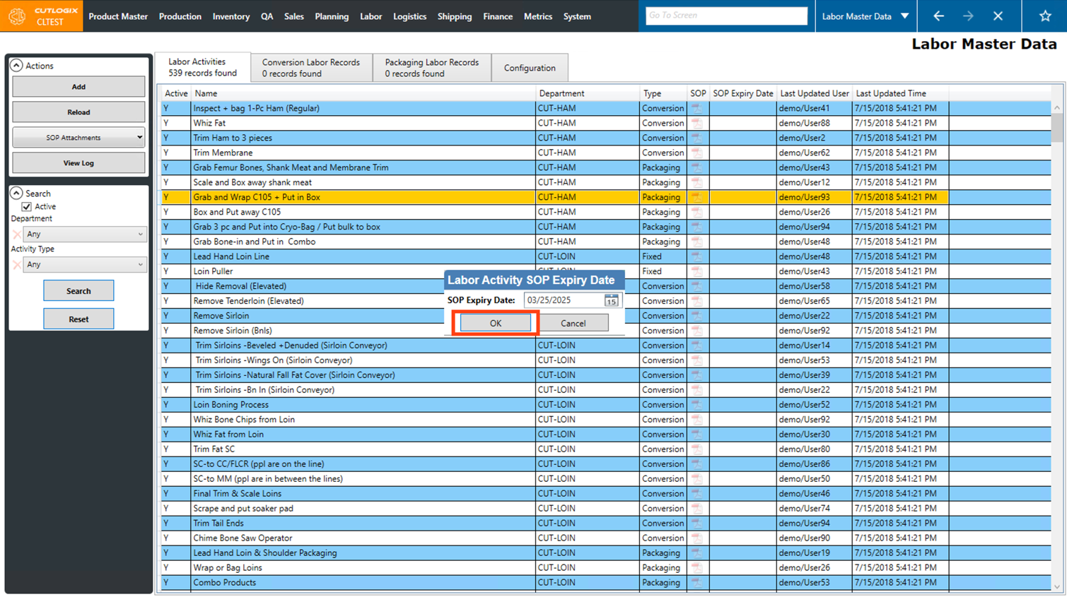 Step 6: Once the SOP Expiry Date has been set, click the "OK" button. The SOP icon beside the labor activity will now display in full color, indicating that the activity has an attached SOP.