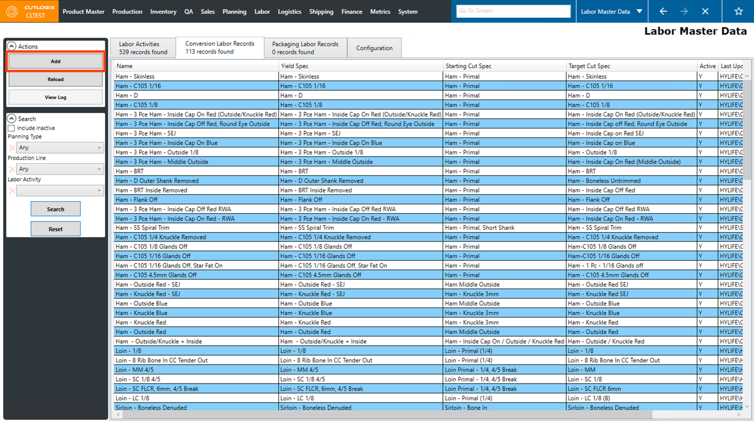 Step 5: Next, you can start adding Manning Records. Manning records are labor activities (from the labor activities tab) that are involved in competing the conversion labor record (converting meat from one cut spec to another). Click the green "+" button under the "Manning Records" title.