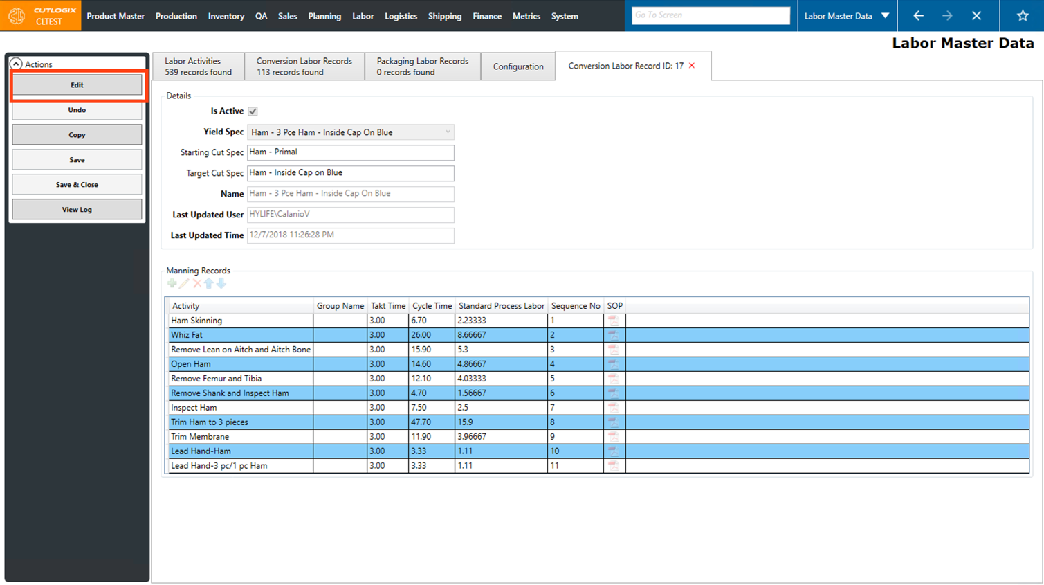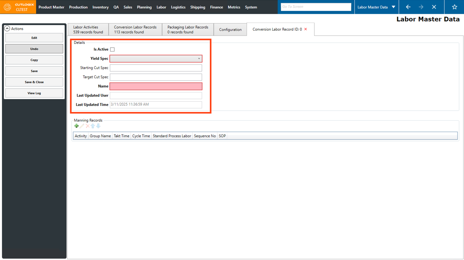 Step 4: A new tab will open on the page. This tab is a duplicate of the record that was copied. Here you can make changes to the record such as changing the yield spec, name and adding/editing manning records to make it suitable for the new conversion labor record. (Further information on how to edit can be found in the section above.)