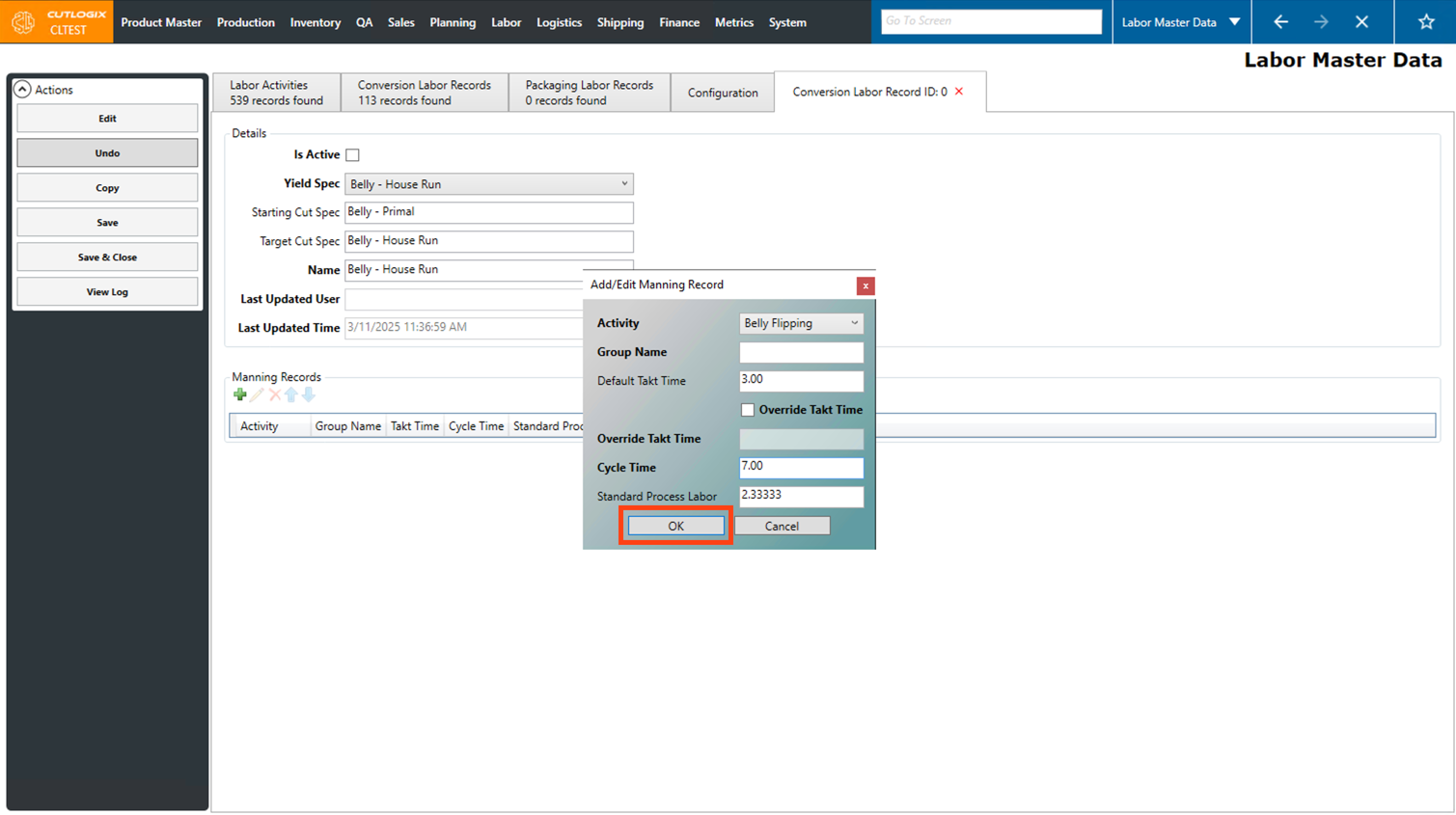 Step 2: Go to the "Conversion Labor Records" tab and double-click on the conversion labor record that you want to edit.