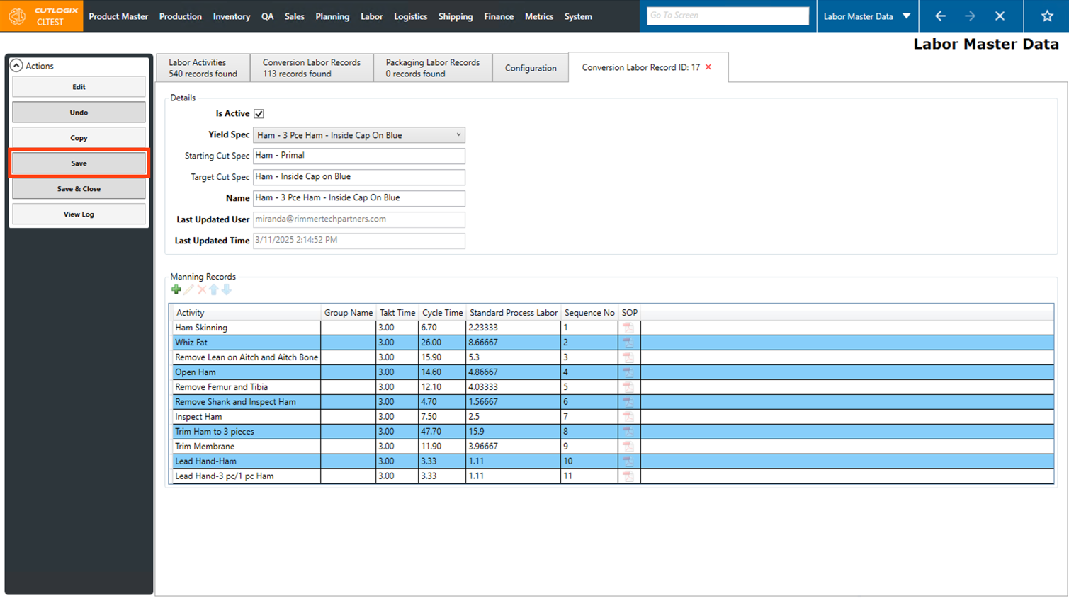 Step 6: Once you're finished making changes to the conversion labor record, click the "Save" button in the Actions Panel to save your changes. Alternatively if you want to save and close the edit tab, click the "Save and Close" button.