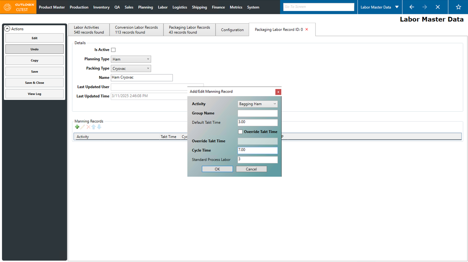 Step 7: Once all the required fields have been entered for the manning record, click the "OK" button to save the manning record on the packaging labor record.