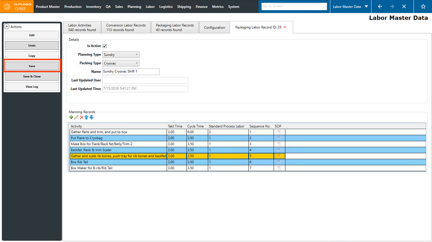 Step 6: Once you're finished making changes to the packaging labor record, click the "Save" button in the Actions Panel to save your changes. Alternatively if you want to save and close the edit tab, click the "Save and Close" button.
