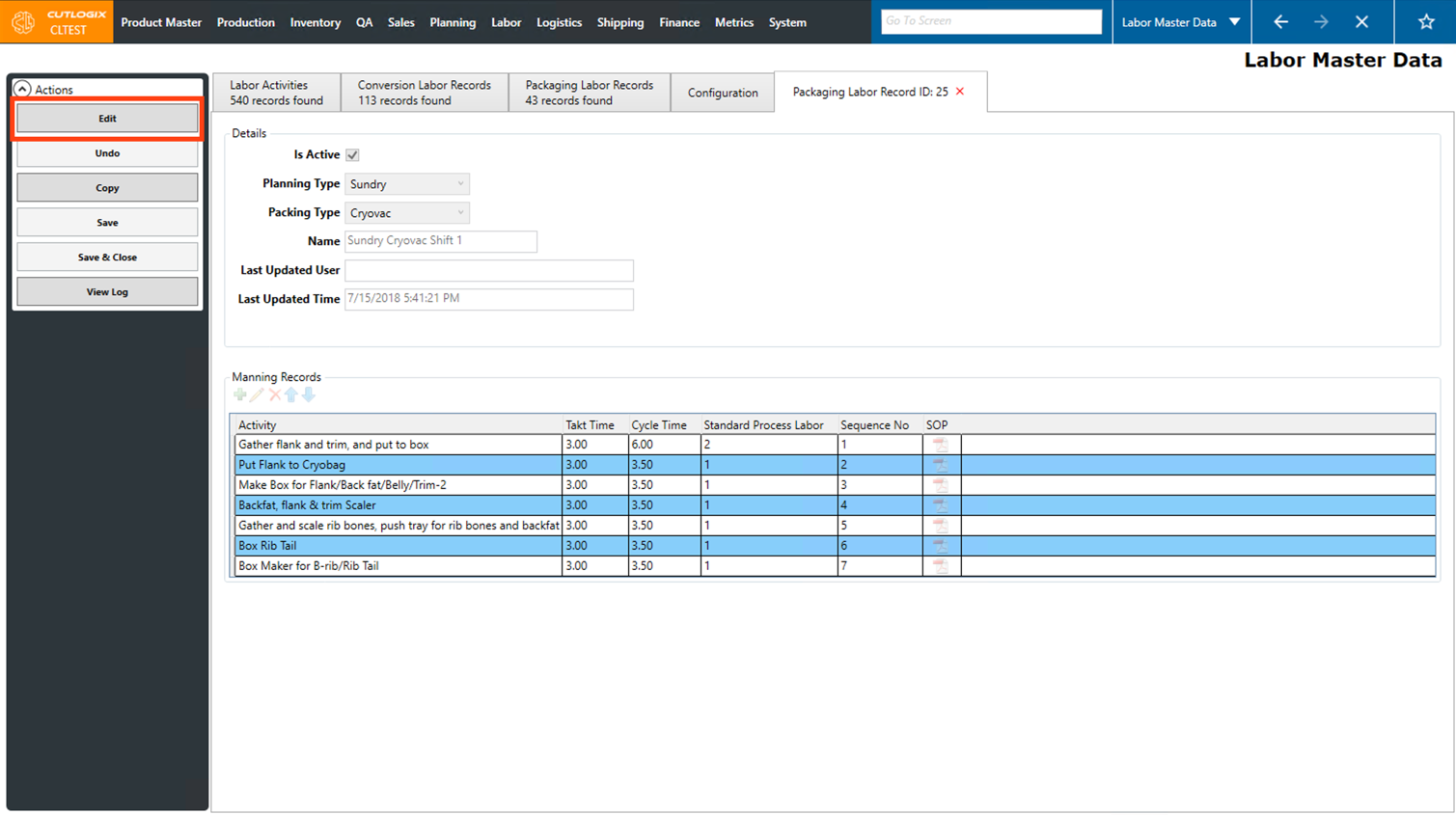 Step 3: A tab will open, displaying the details about the packaging labor record. Click the "Edit" button in the Actions Panel to enable editing the packaging record.