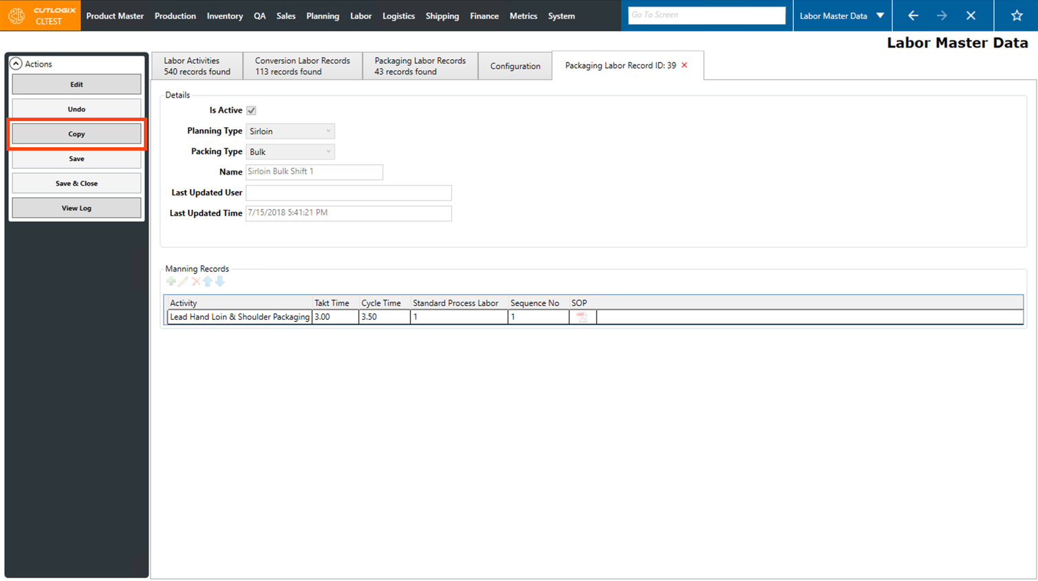 Step 3: The details page for the packaging labor record will open. Click on the "Copy" button in the Actions Panel.