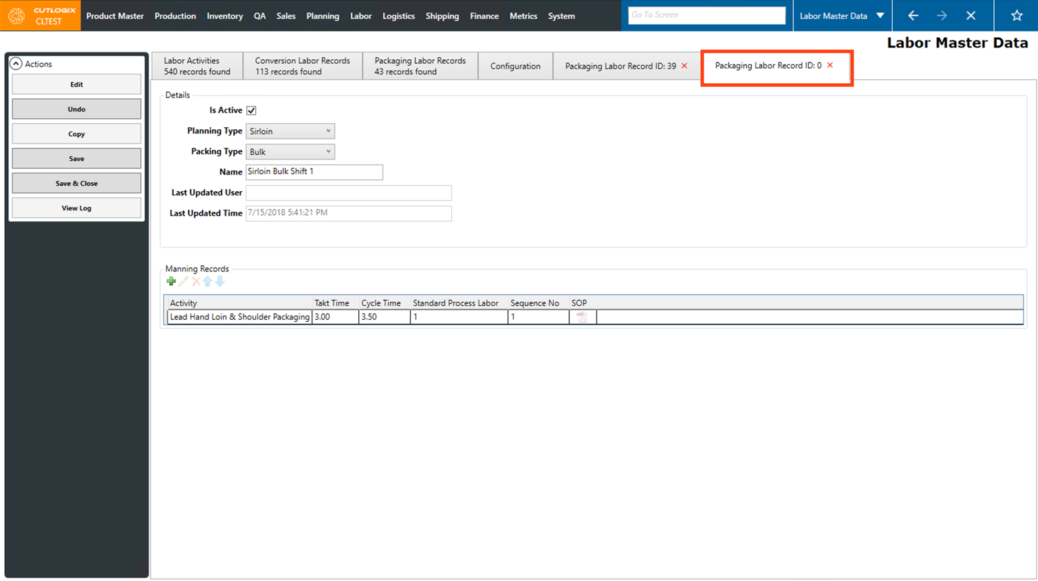 Step 5: Once all the modifications to the new packaging labor record have been completed, click the "Save" button in the Actions Panel to save the new record. Alternatively if you want to save and close the details tab, click the "Save and Close" button.