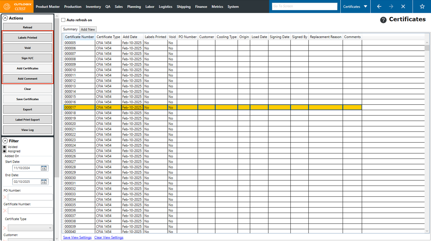 DemoStep 1: Navigate to the "Certificates" page (Under the Logistics menu → Certificates).