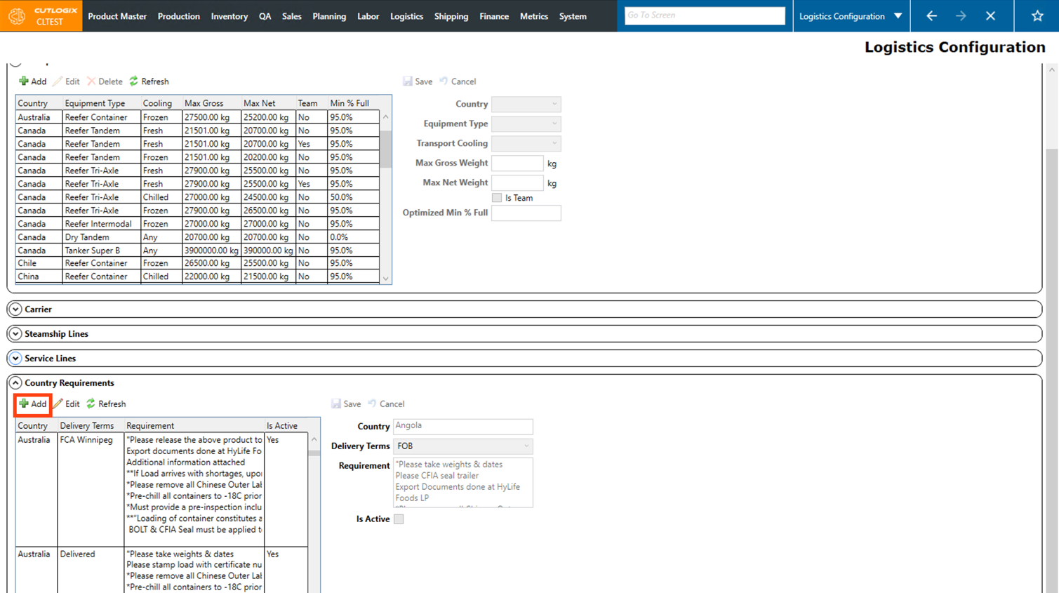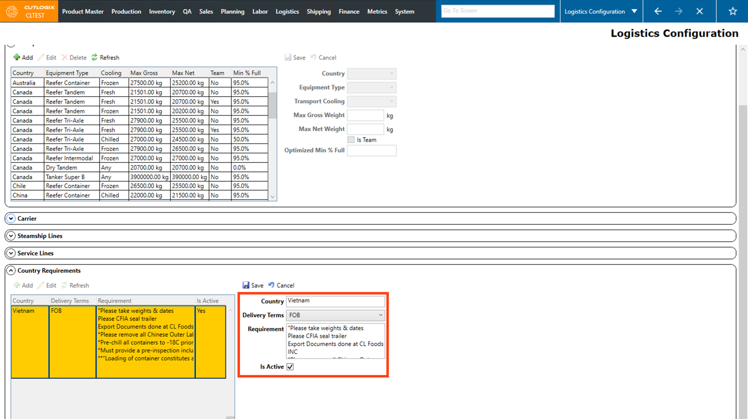 • Transport Cooling: Choose the type of cooling that this transport method is for, from the dropdown list. (Any, Fresh, Frozen, Chilled).