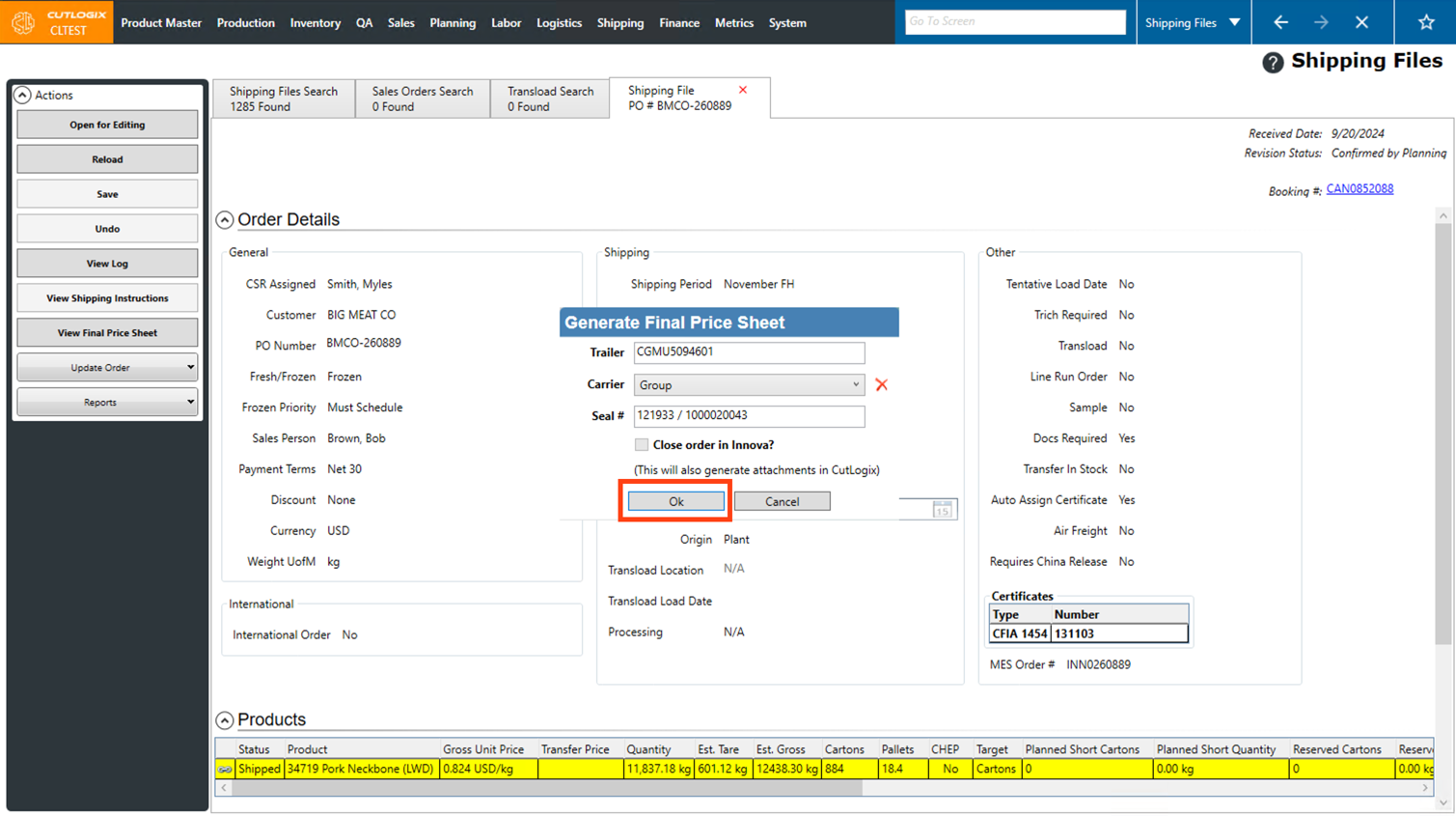Step 4: A dialog will then open, displaying trailer, carrier and seal information. This can be modified/added as needed. Once those have been filled out, click the "OK" button to proceed with viewing the final price sheet.