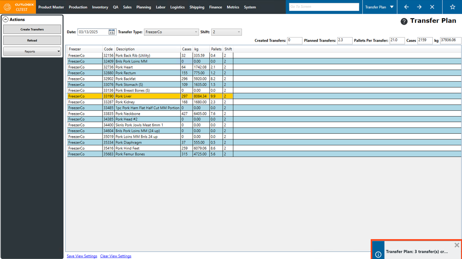 Demo Since the production plan will include producing products that need to be frozen, all of this product will need to be transferred to a freezer. This includes products that have been sold where the cooling type is frozen or production defaults that have been made that are frozen. This page enables you to create a transfer plan for all of those products to get to a freezer.