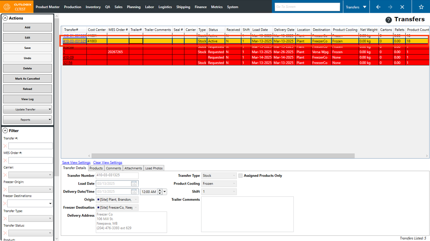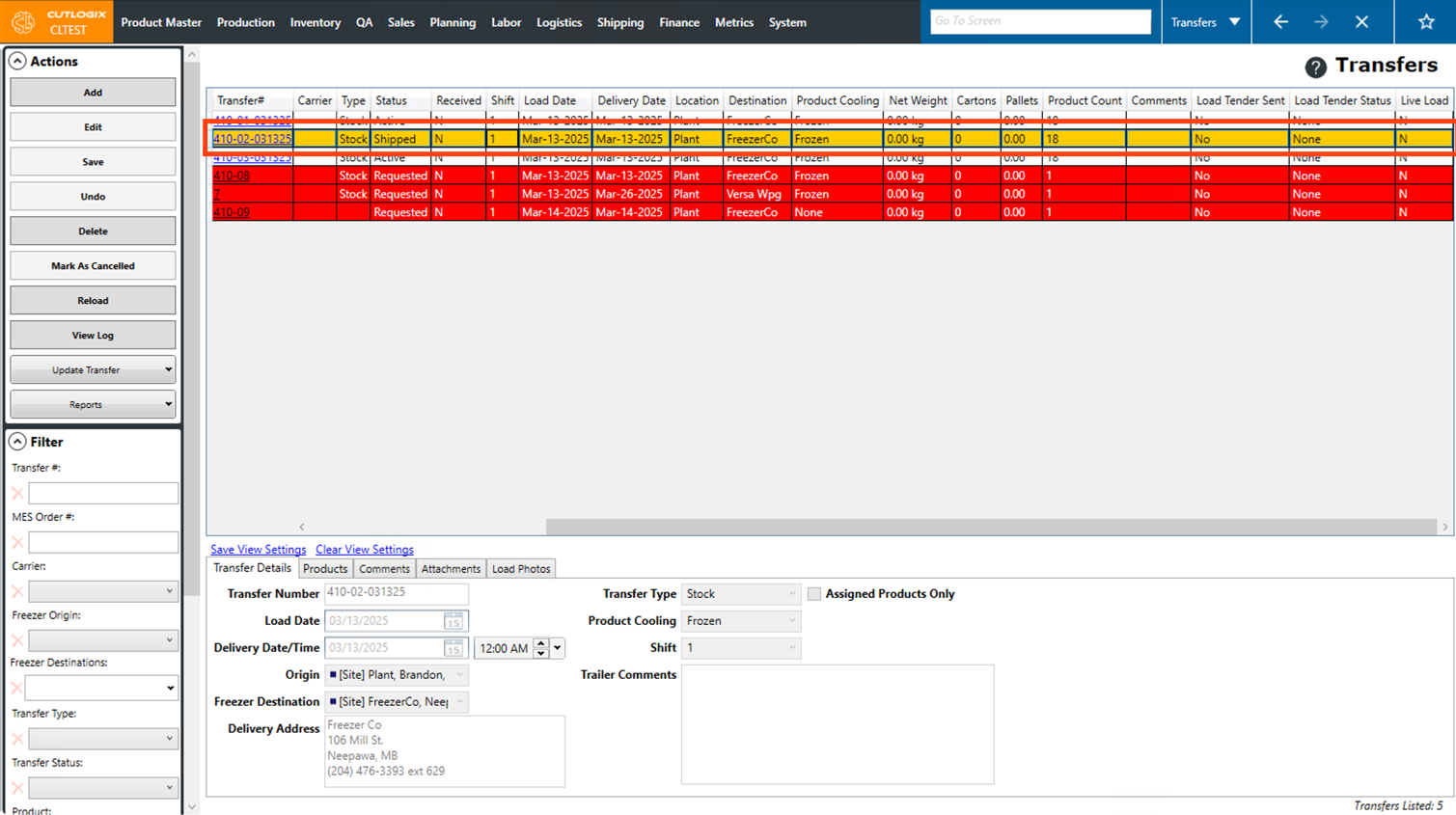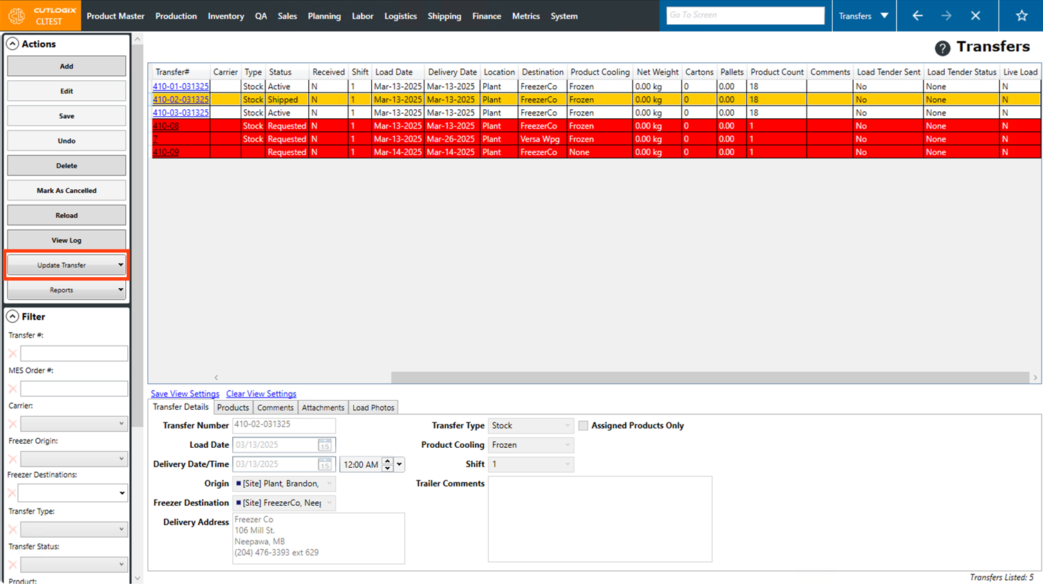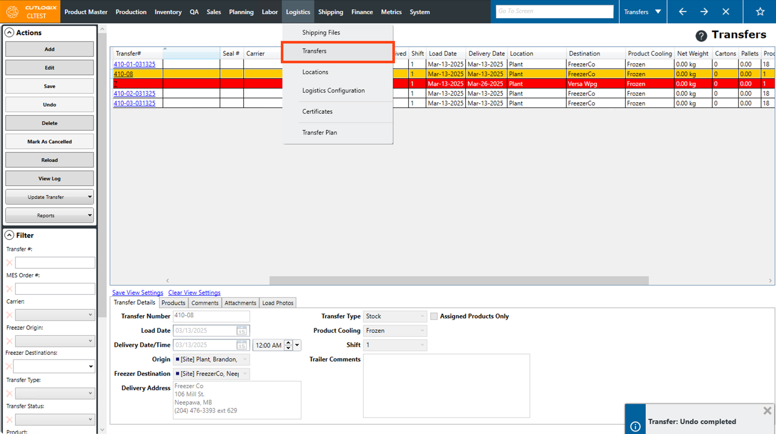 Demo Note: Multiple transfers can be created for frozen products at once by using the "Create Transfers" option on the "Transfer Plan" page (under the Logistics menu).