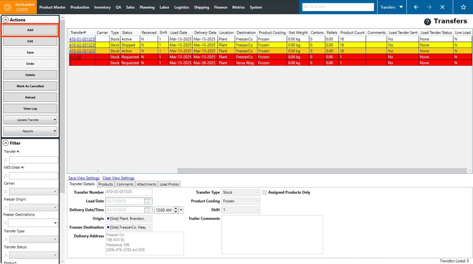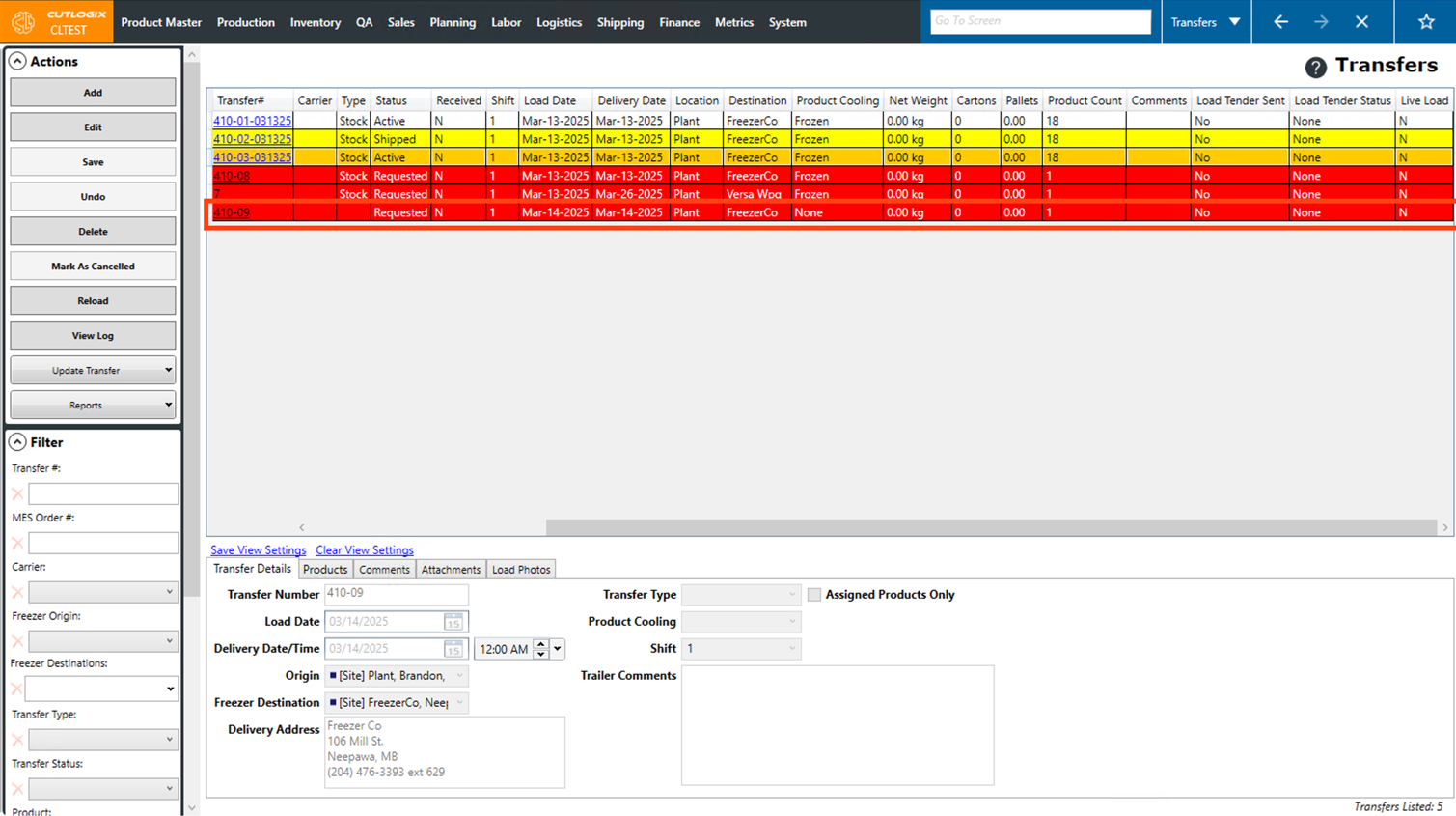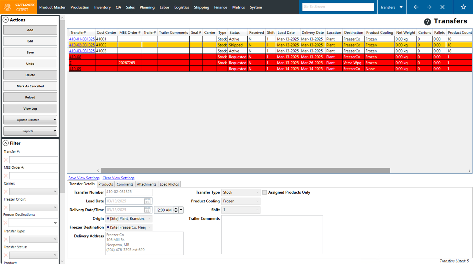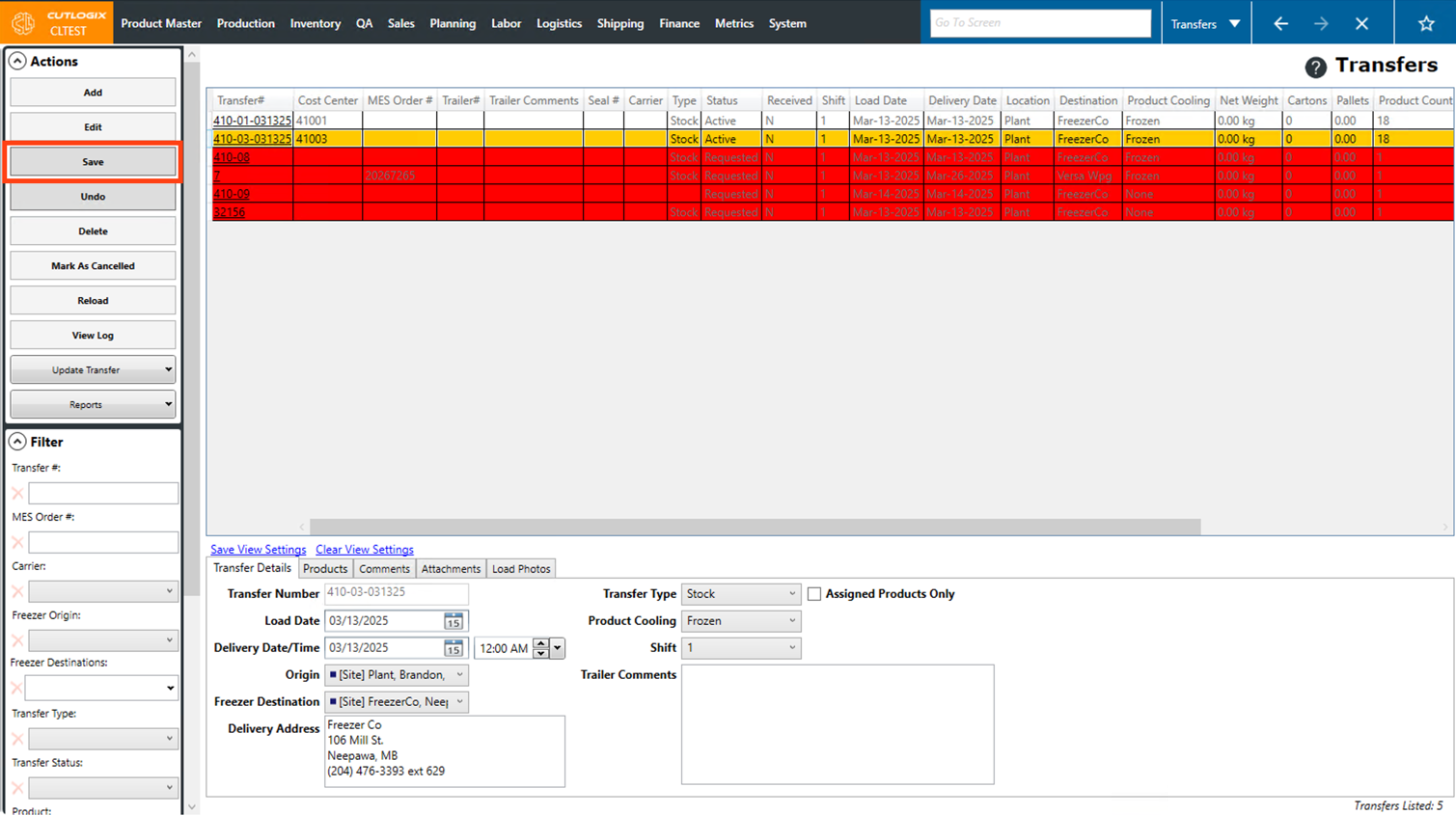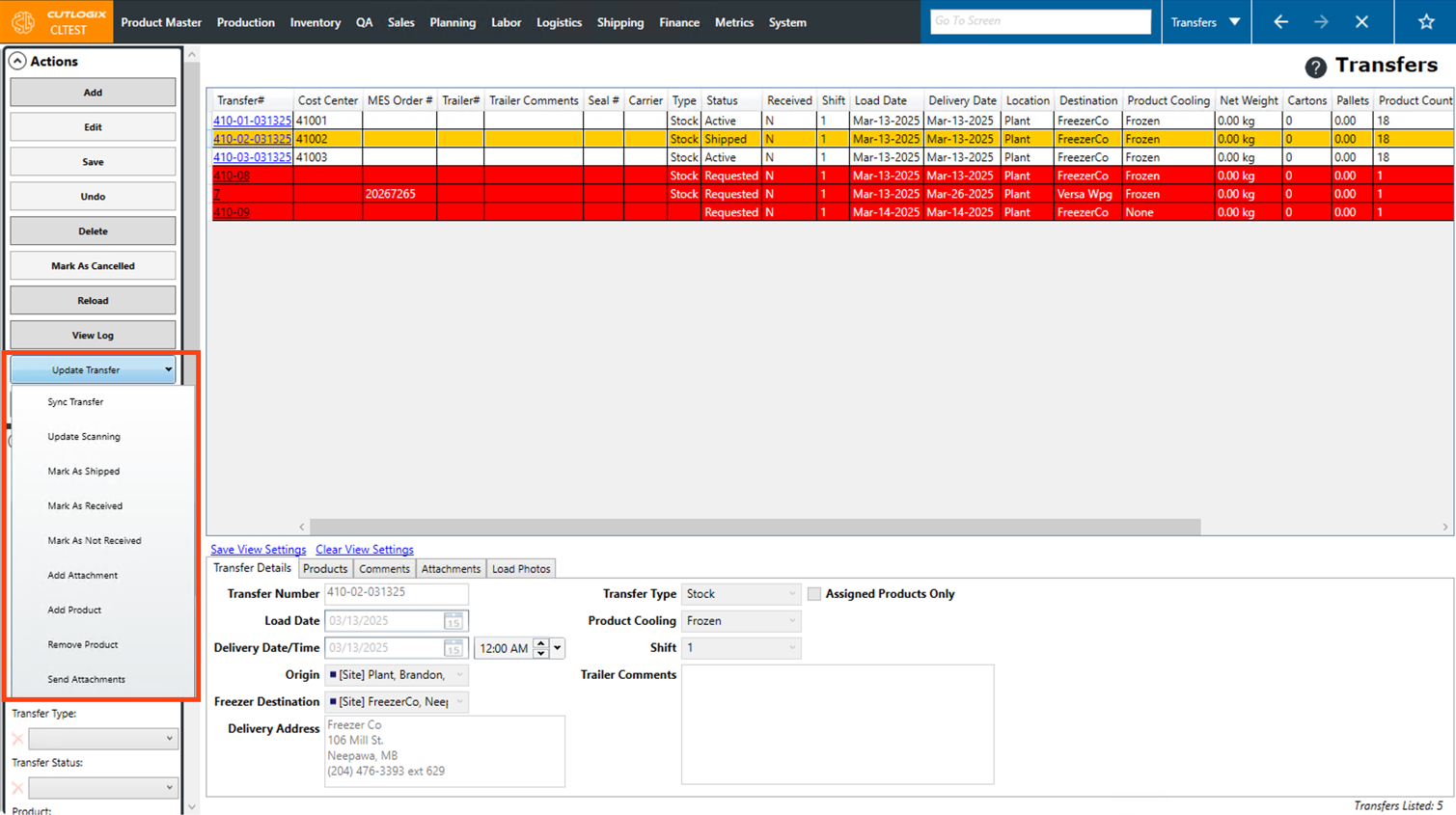 Demo Note: Multiple transfers can be created for frozen products at once by using the "Create Transfers" option on the "Transfer Plan" page (under the Logistics menu).