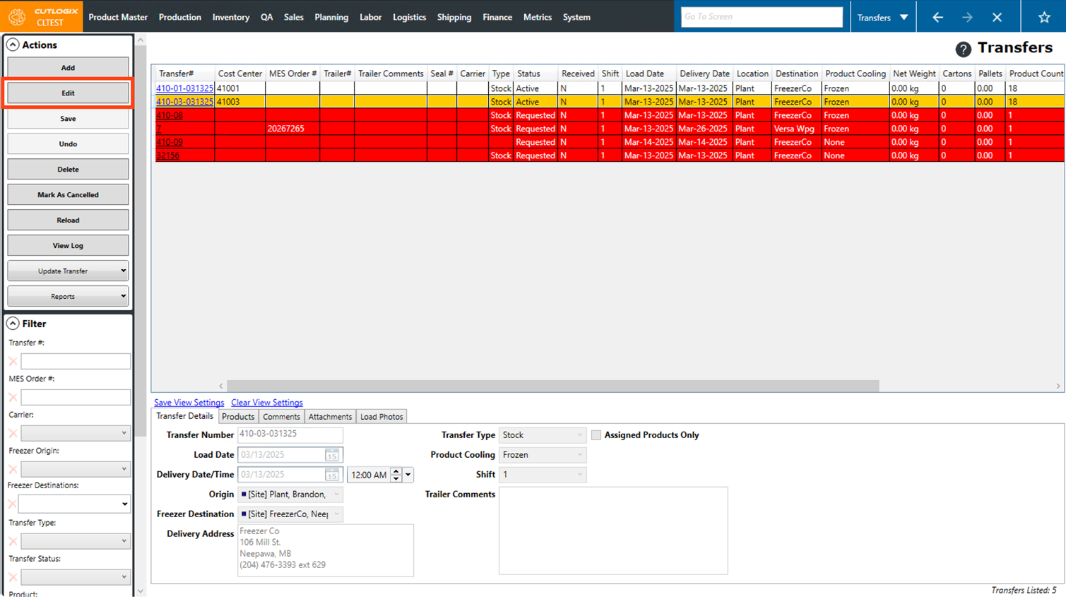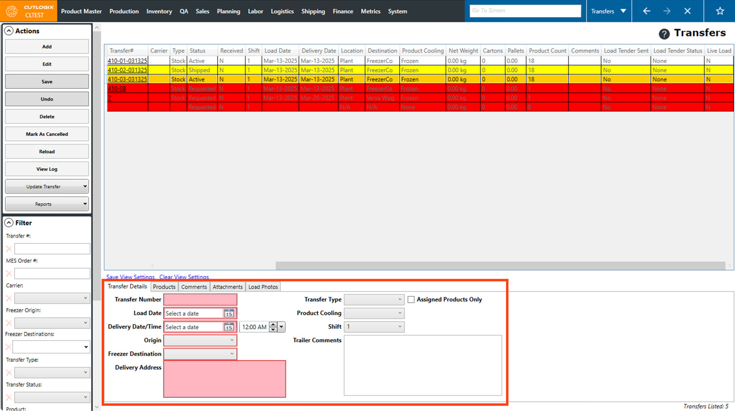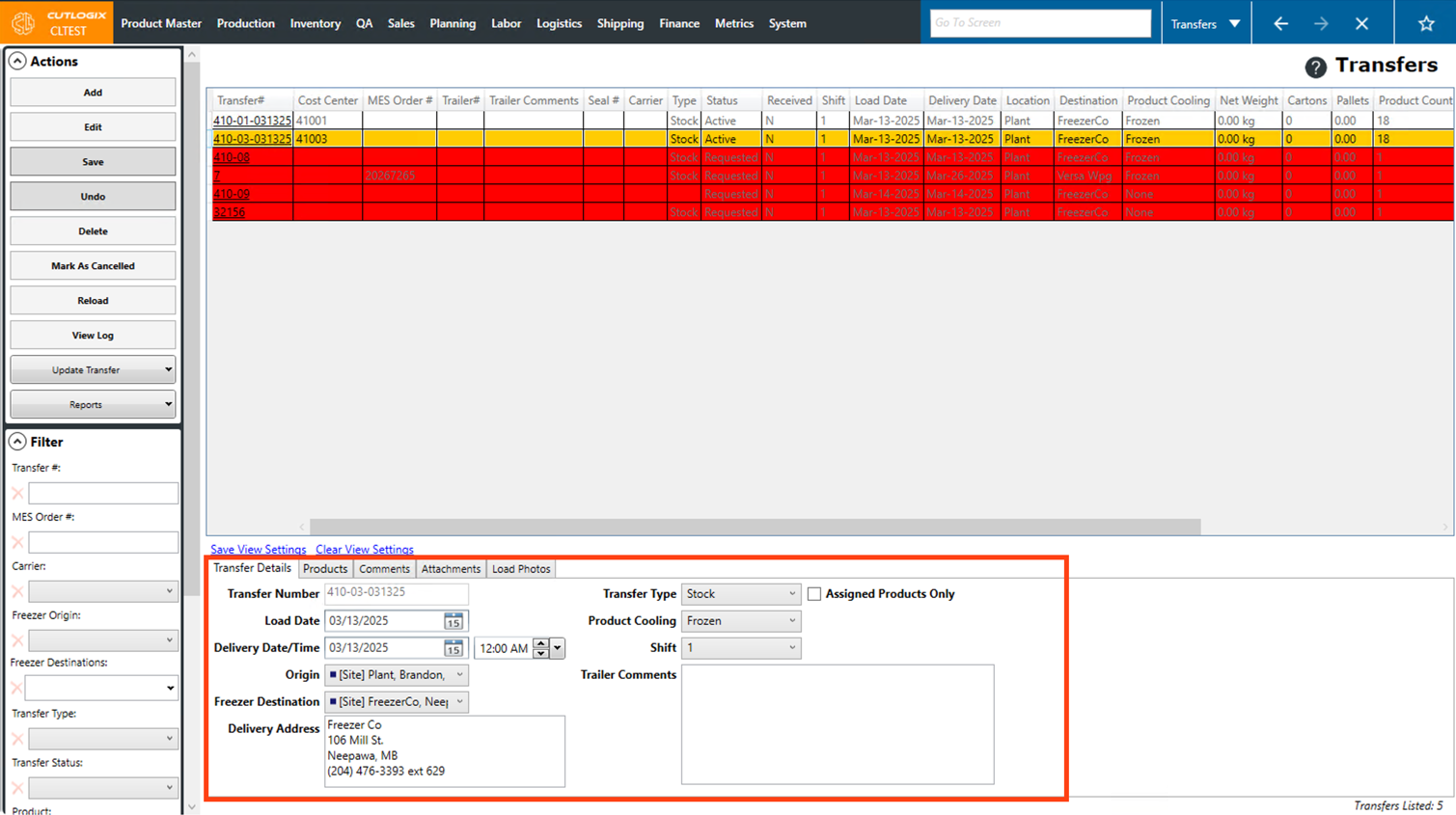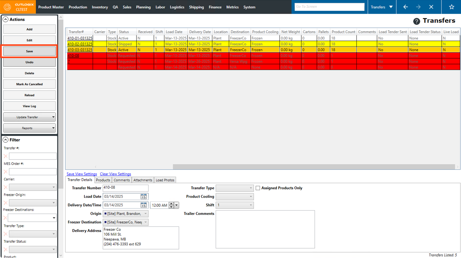 Demo Note: Multiple transfers can be created for frozen products at once by using the "Create Transfers" option on the "Transfer Plan" page (under the Logistics menu).