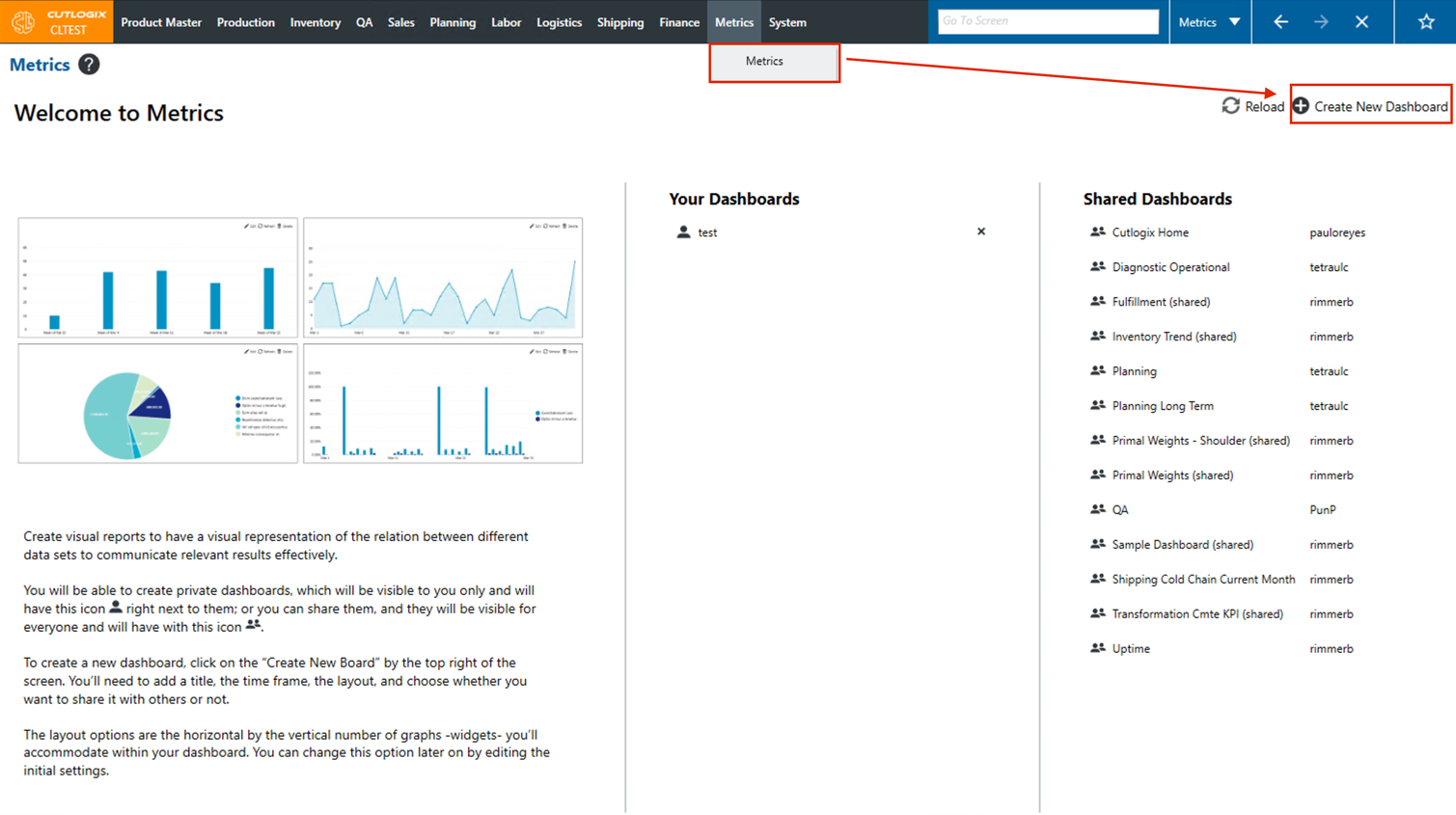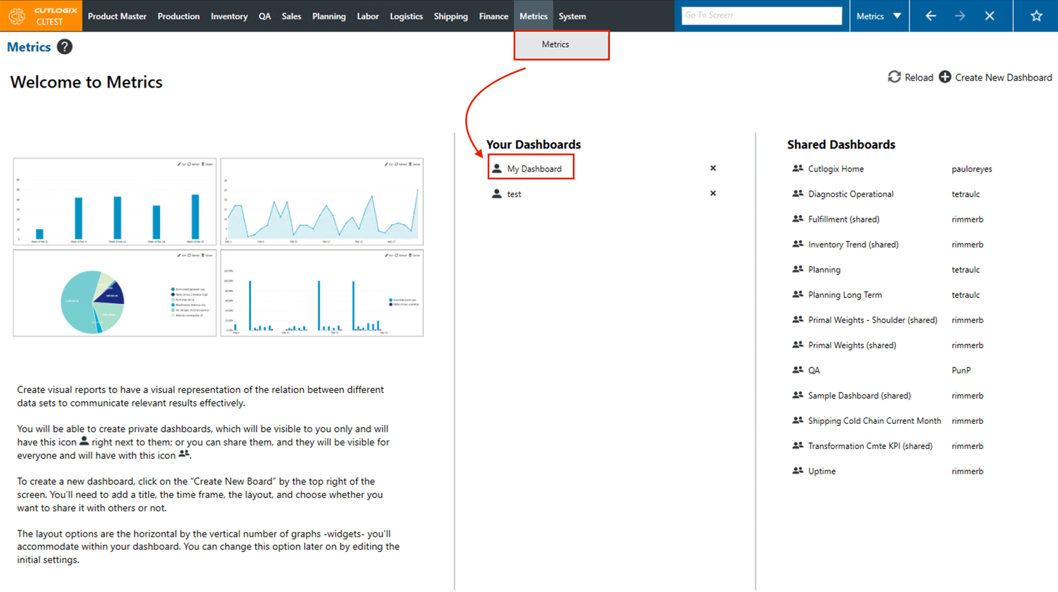 DemoStep 1: Navigate to the "Metrics" page (Under the Metrics menu → Metrics), then click the "Create New Dashboard" button.