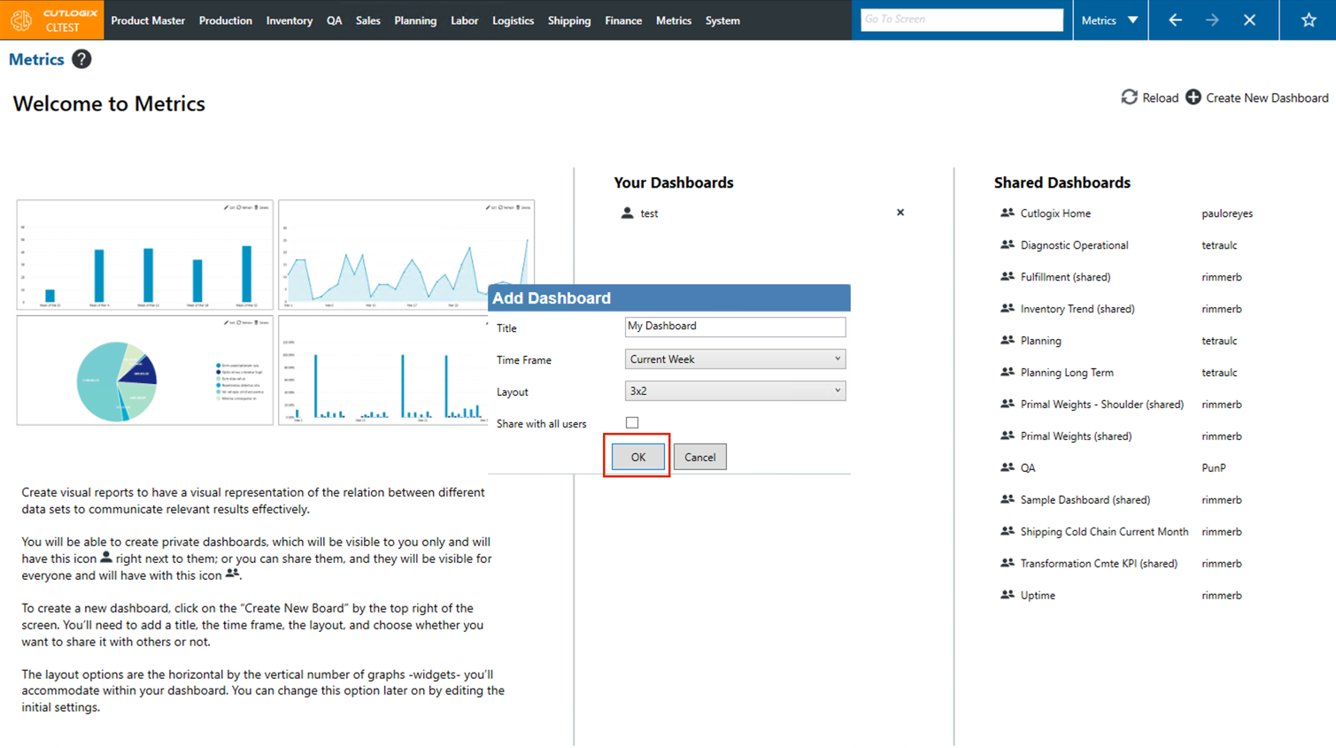 Step 2: A popup will appear, asking you for information about the new dashboard. Fields highlighted in red are required and must be entered before the dashboard can be created. These fields are as follows: