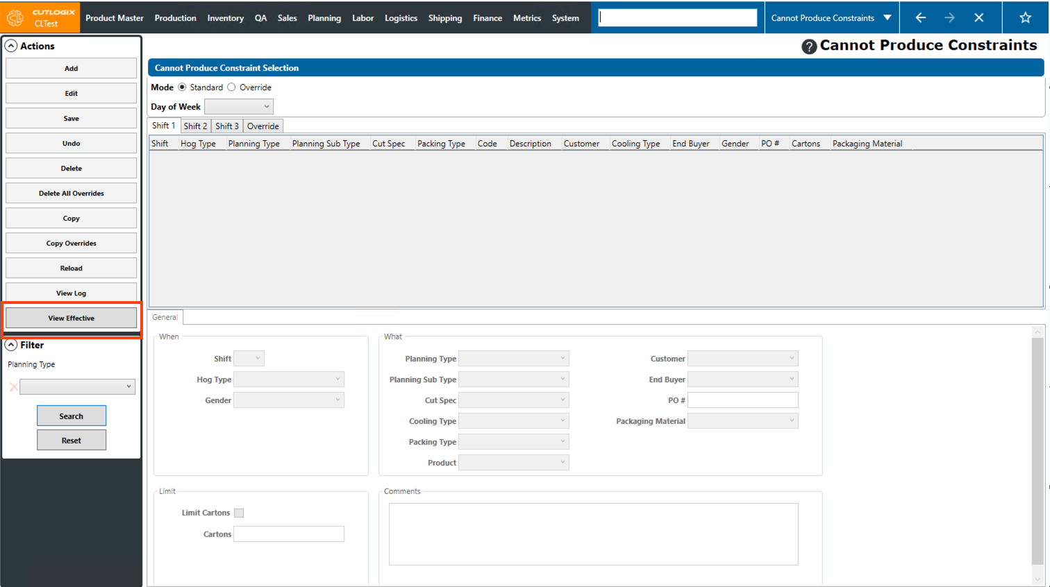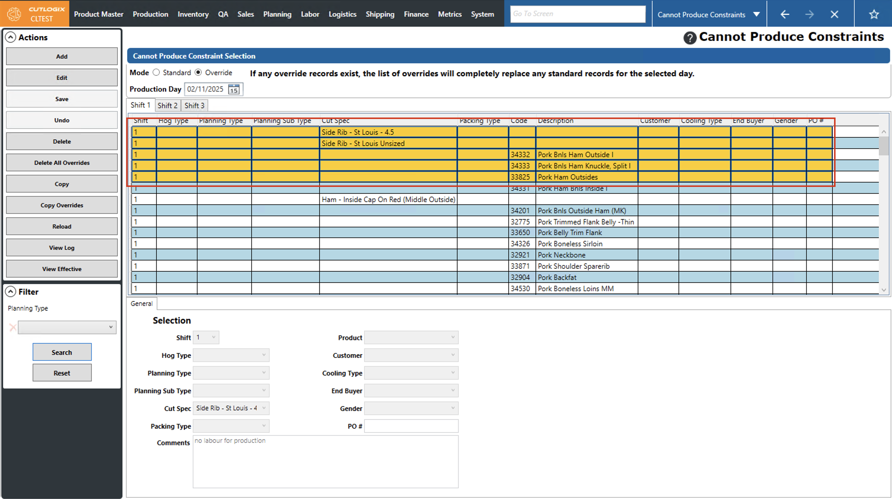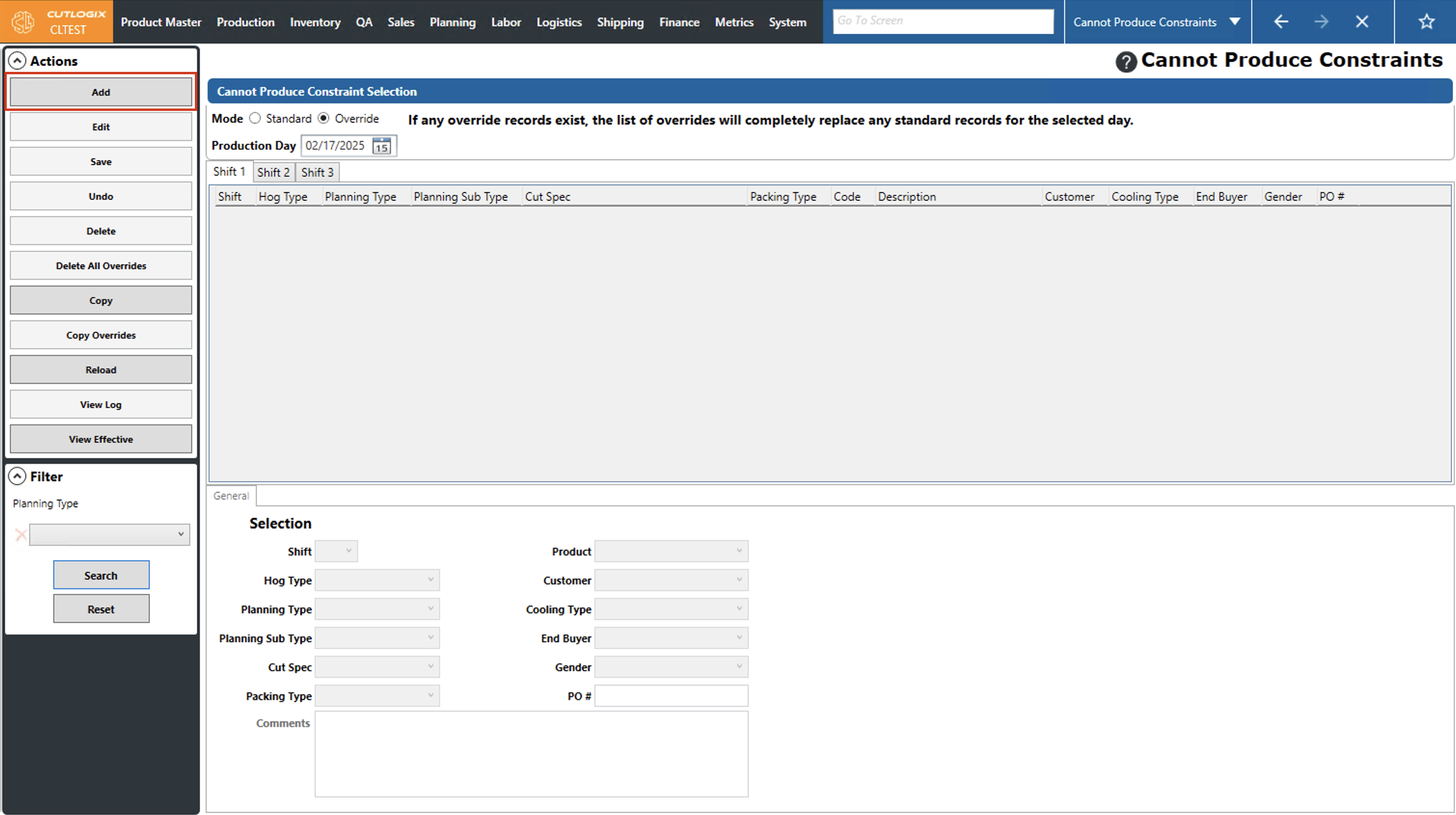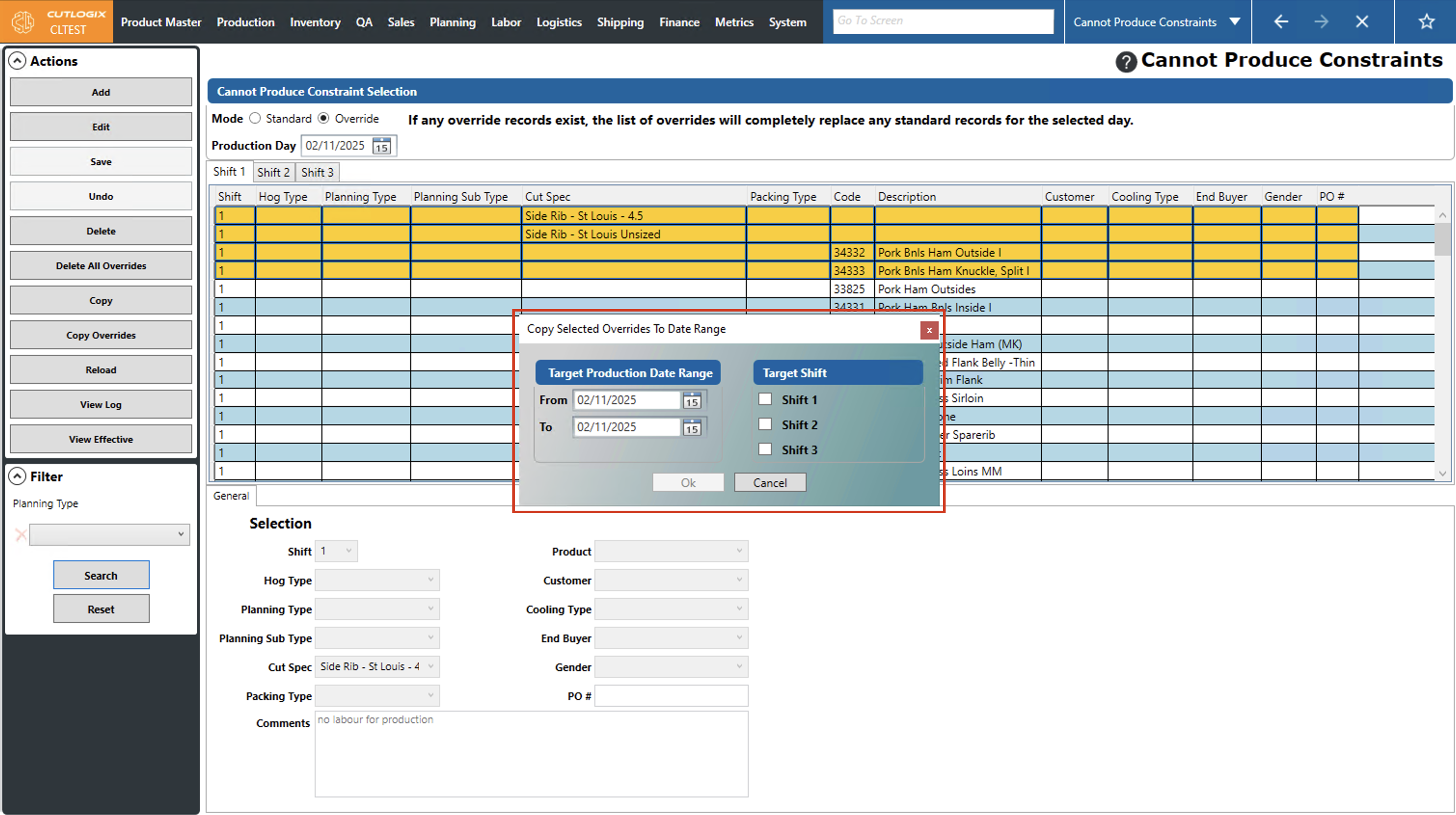 DemoStep 1: Navigate to the "Cannot Produce Constraints" page (Under the Planning menu → Planning Rules Config → Cannot Produce Constraints), then click on the "Override" option and choose a production date using the datepicker and the shift using the shift tabs.
