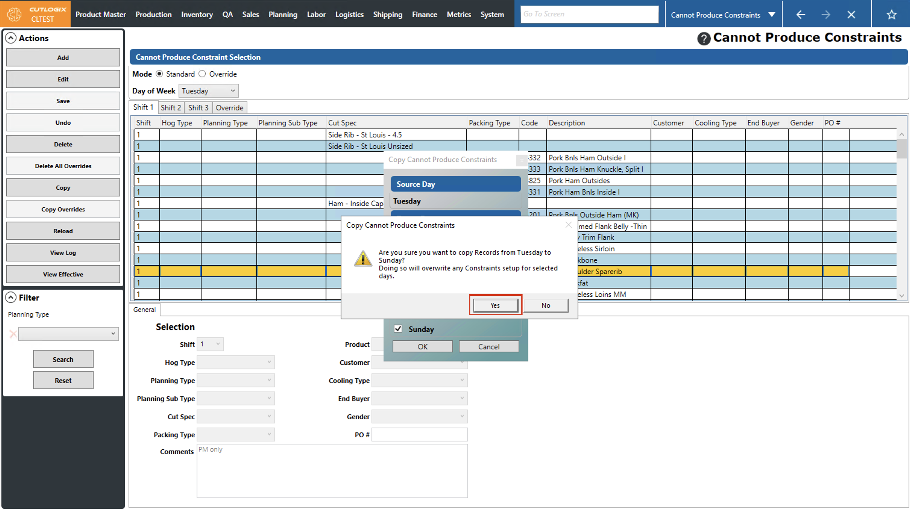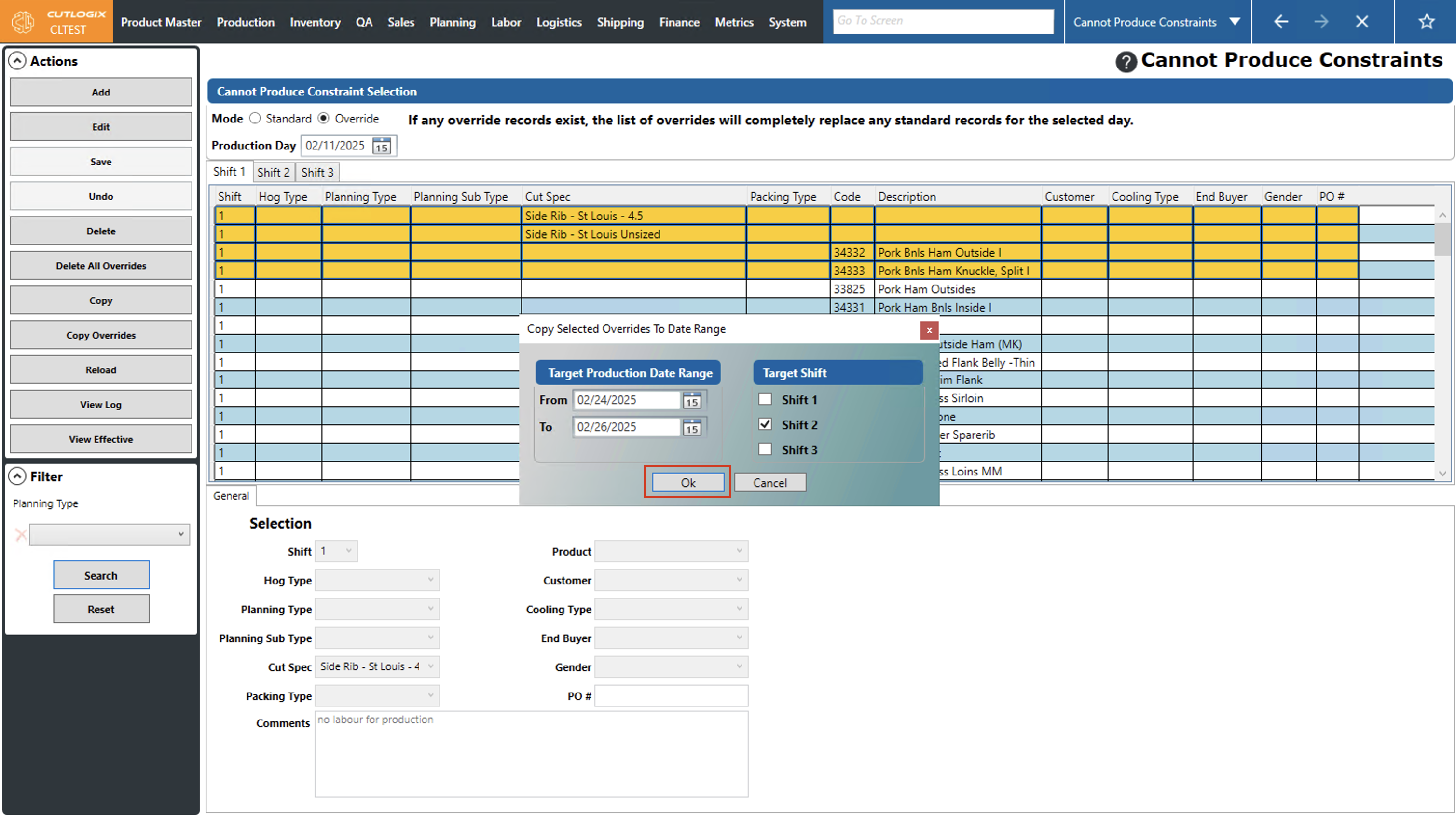 DemoStep 1: Navigate to the "Cannot Produce Constraints" page (Under the Planning menu → Planning Rules Config → Cannot Produce Constraints). Click on the "Override" option, then choose the production day that you want to copy overrides from by using the "Production Day" datepicker (click on the calendar icon).