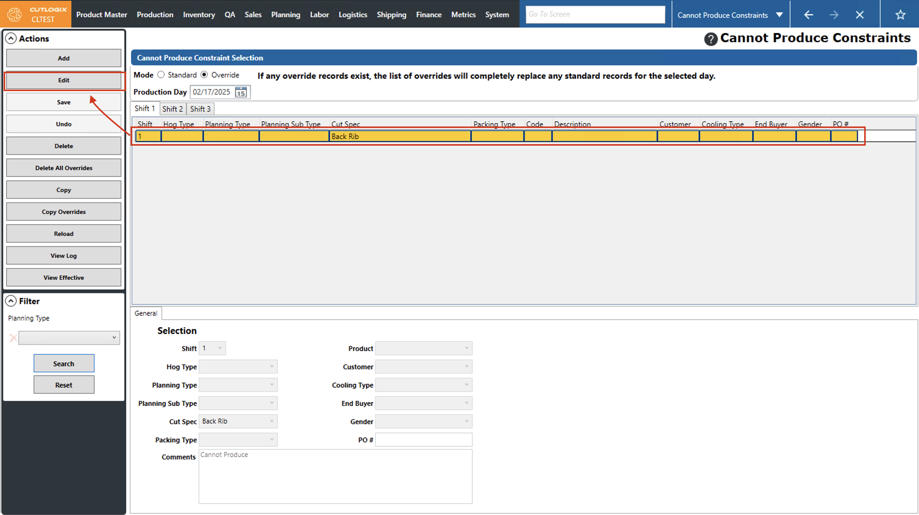 Step 2: Click on the cannot produce constraint override that you want to modify (it will be highlighted in orange once selected), then click the "Edit" button.