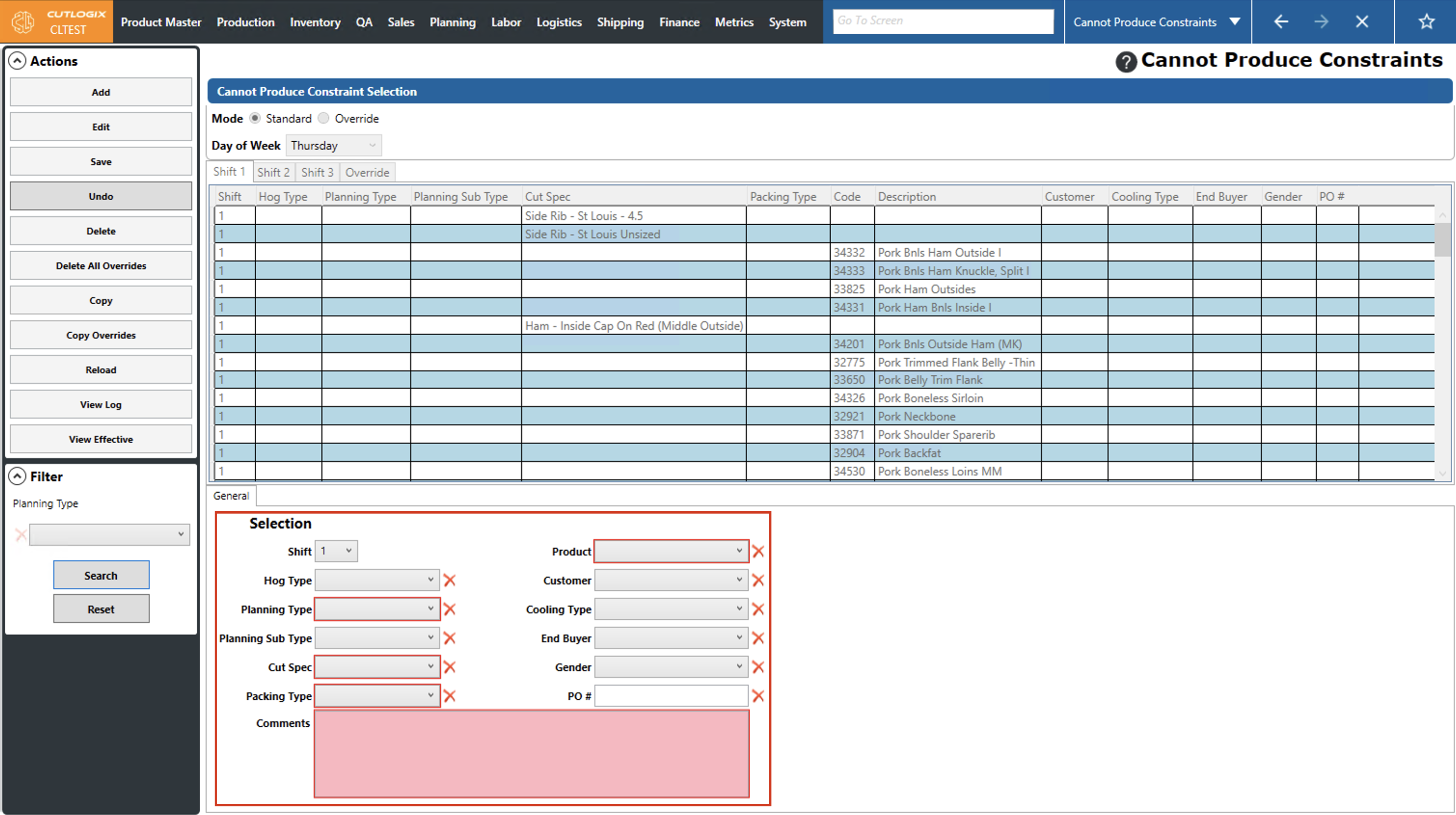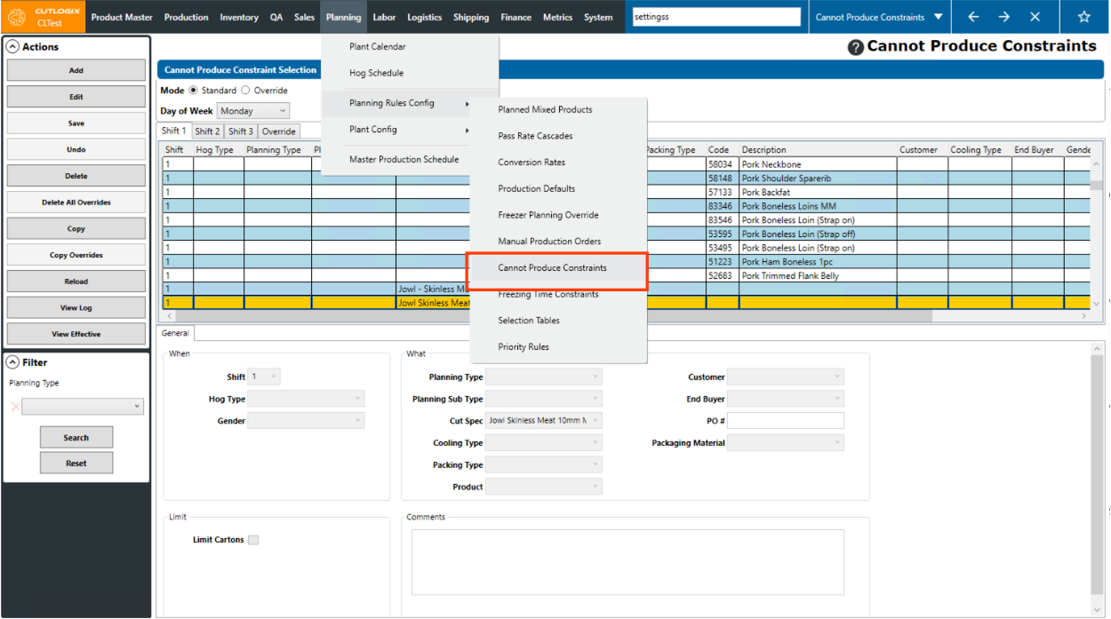DemoStep 1: Navigate to the "Cannot Produce Constraints" page (Under the Planning menu → Planning Rules Config → Cannot Produce Constraints). Select the day of the week that you want to modify a cannot produce constraint for from the "Day of Week" dropdown list and choose the corresponding shift tab that has the constraint that you want to modify.
