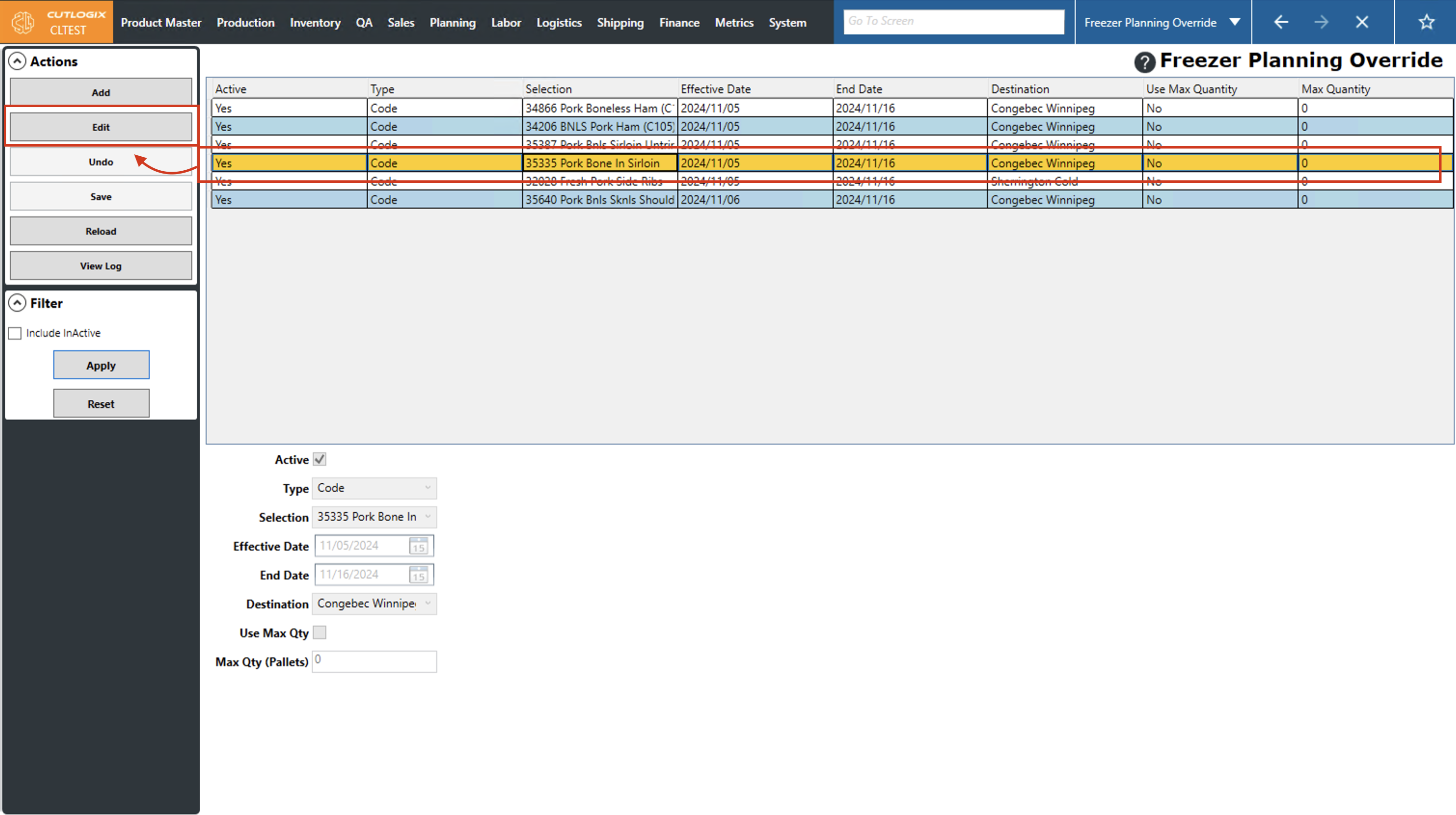 Step 2: Click on the freezer planning override that you want to modify (it will be highlighted in orange once selected), then click the "Edit" button in the Actions Panel.