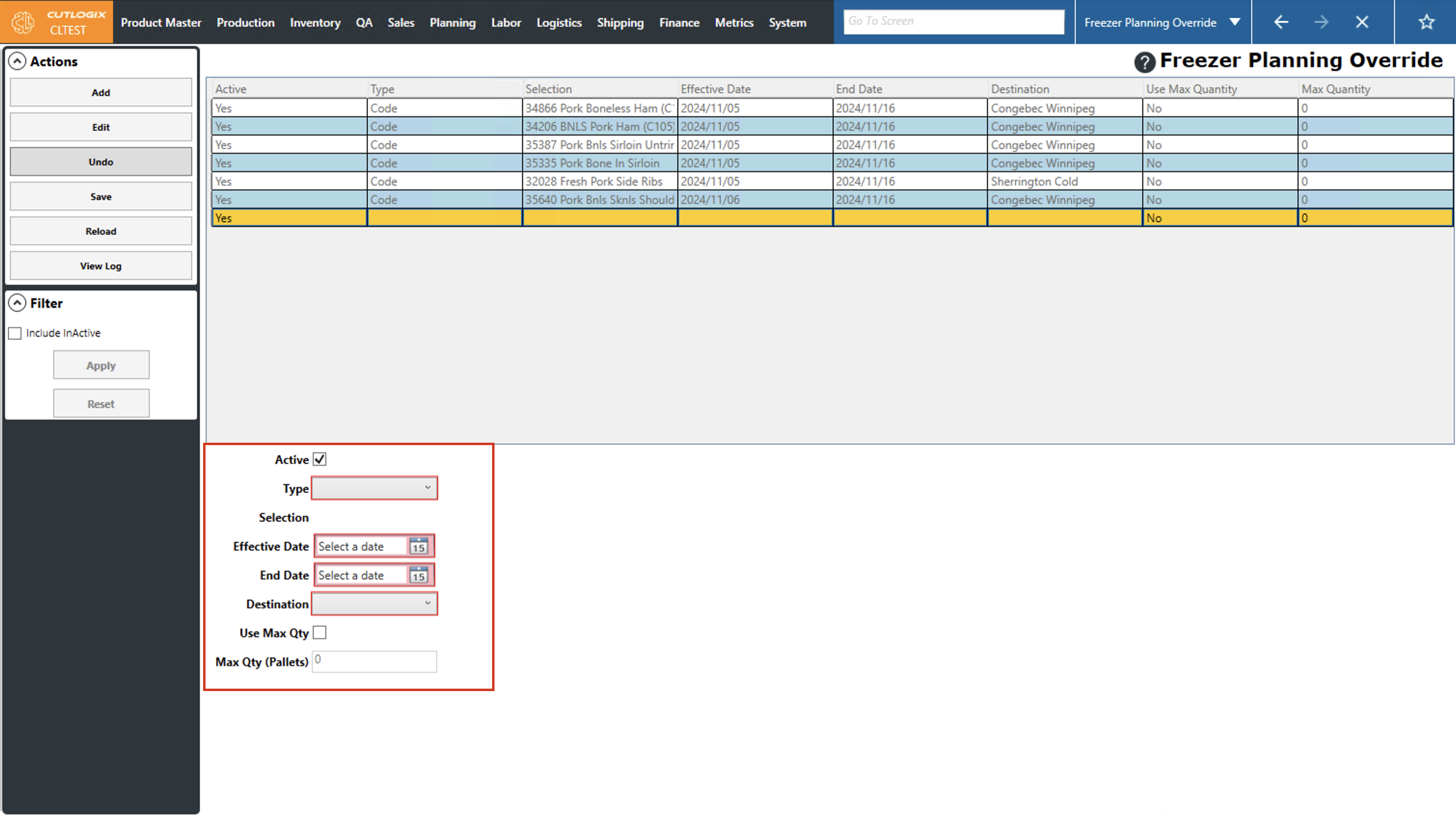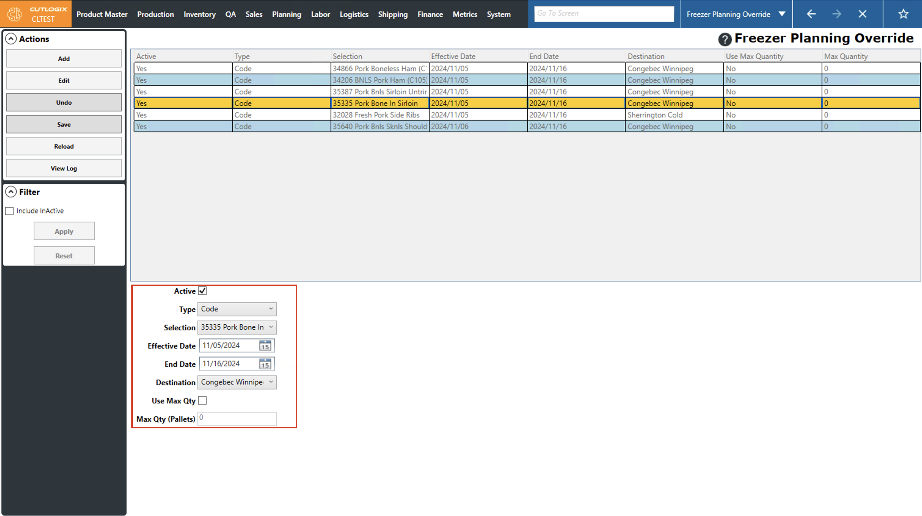 DemoStep 1: Navigate to the "Freezer Planning Override" page (Under the Planning menu → Planning Rules Config → Freezer Planning Override).