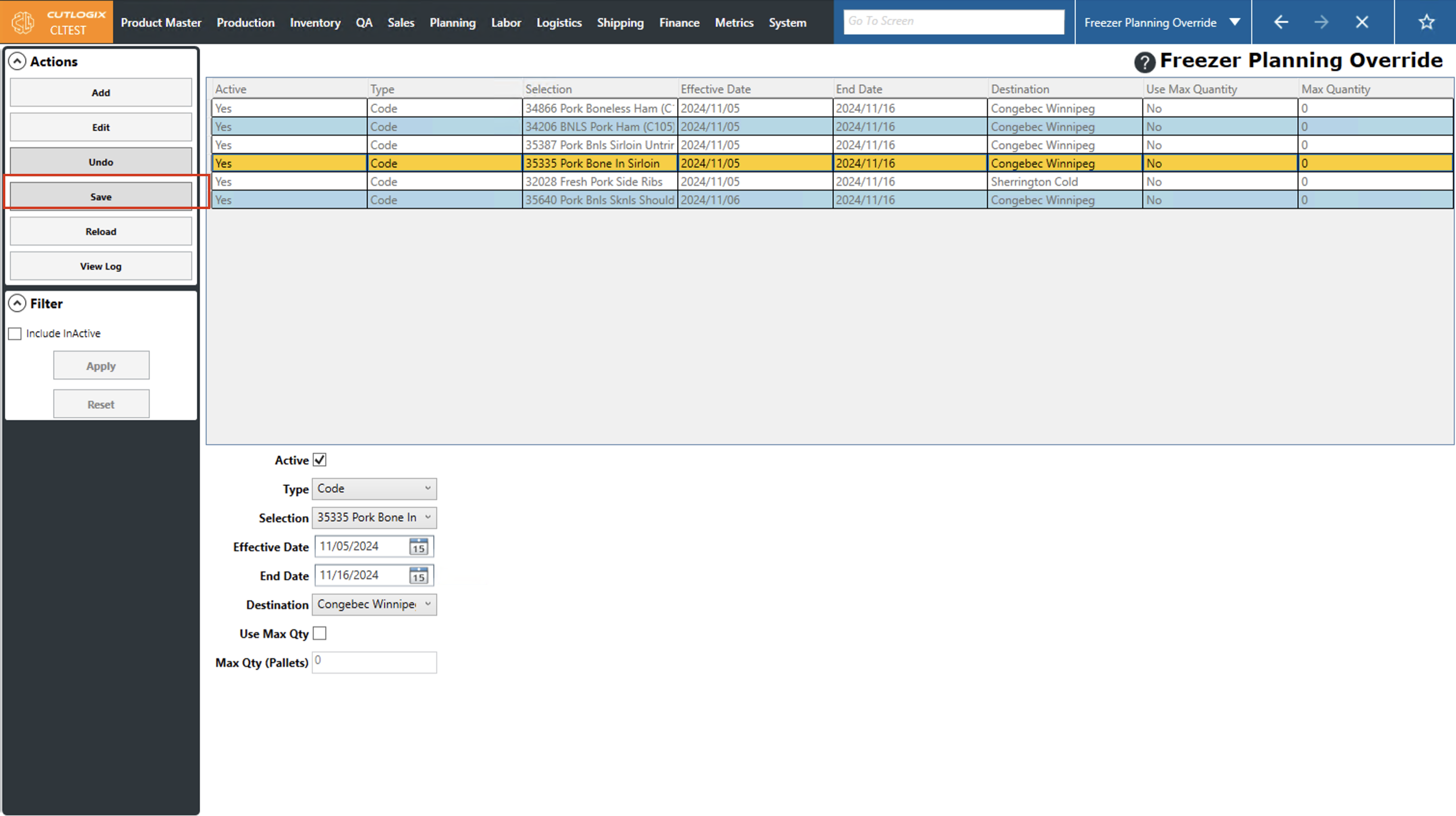 Step 4: Once you've entered all the required information, click the "Save" button in the Actions Panel, this will save the freezer planning override into the list at the top of the screen. If you don't want to save the override, clicking "Undo" in the Actions Panel will discard the override and it will not be saved.
