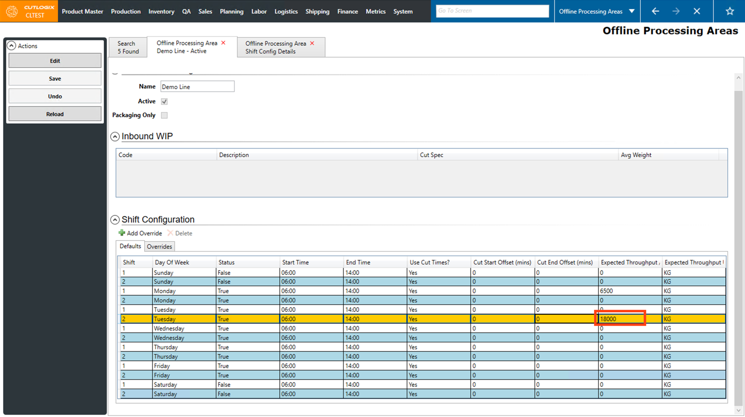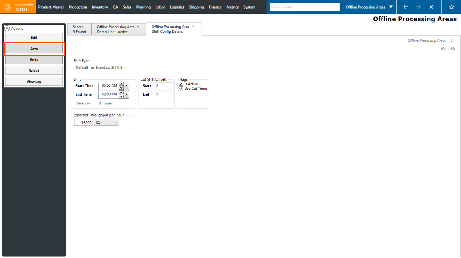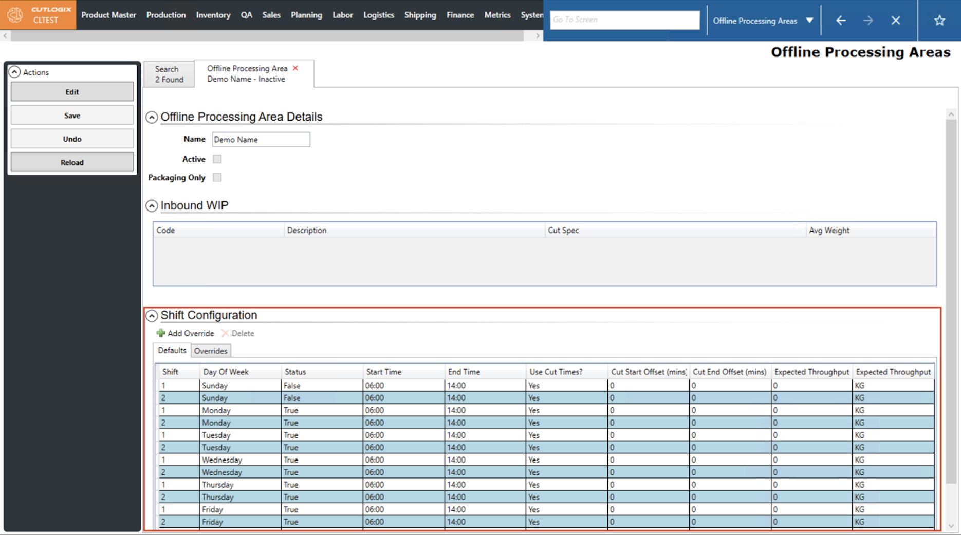 DemoStep 1: After saving a new Offline Processing Area, the default shift configs will be populated with a series of default values. If you are still on the details page after adding a new offline processing area, proceed to step 2.