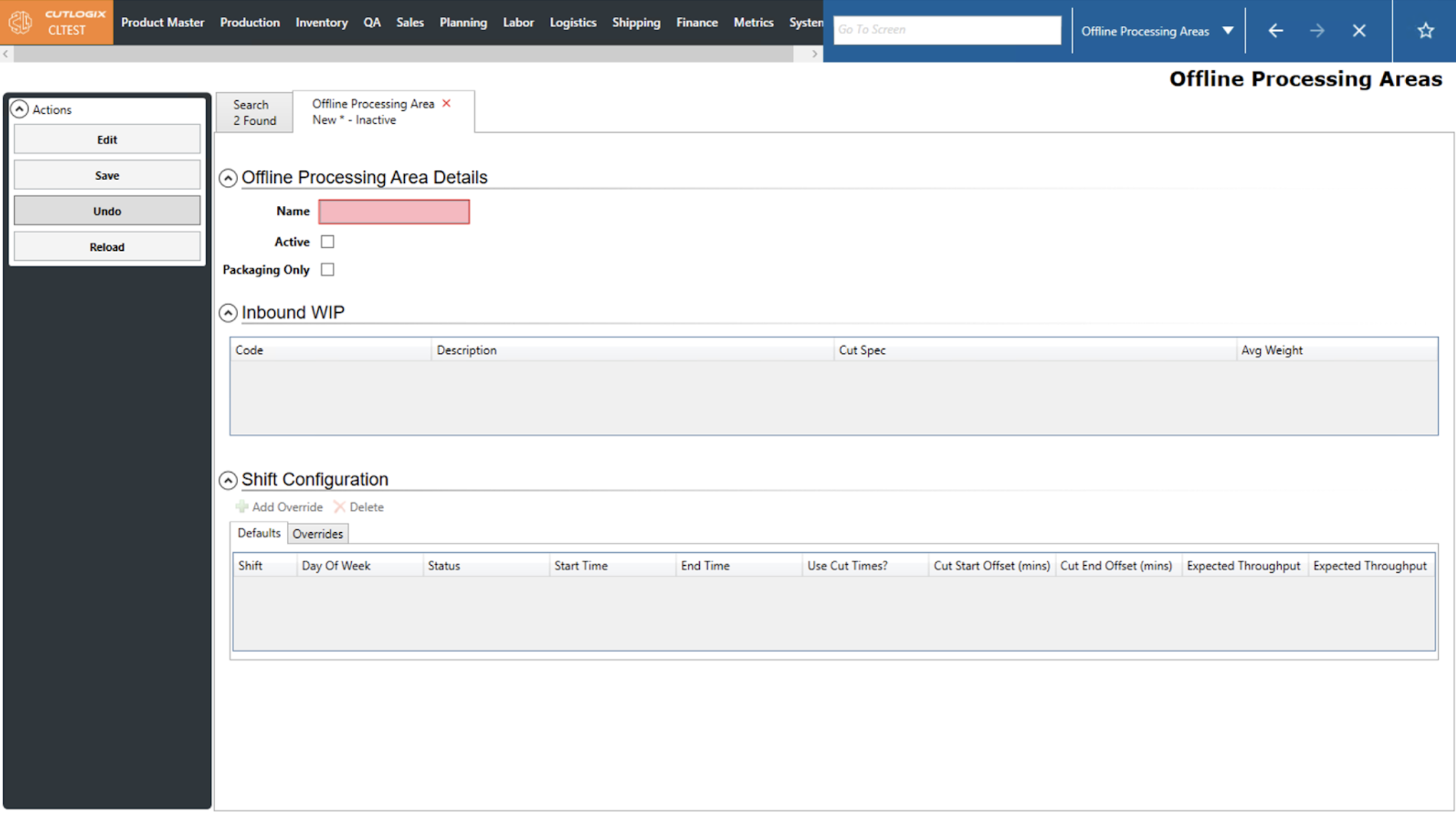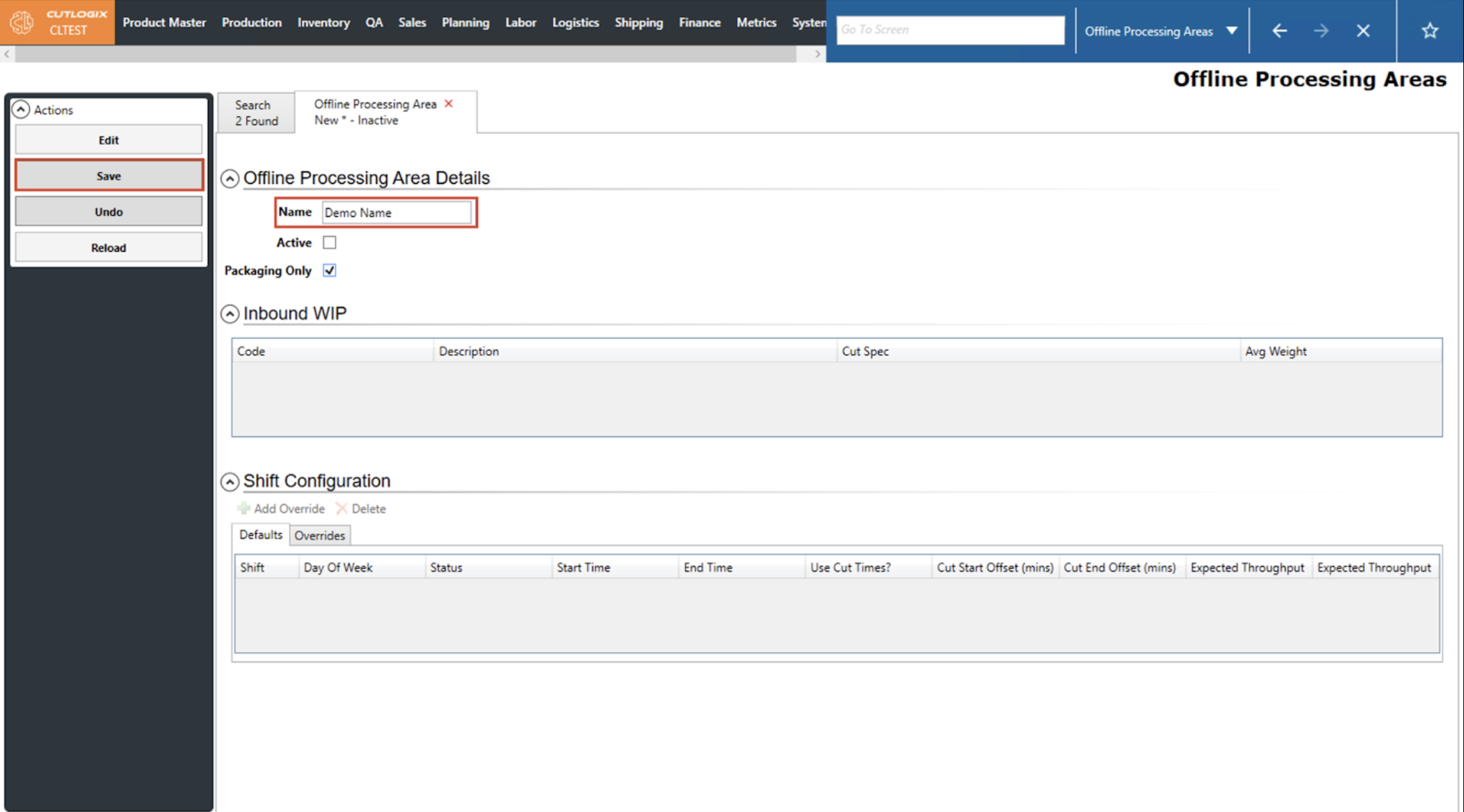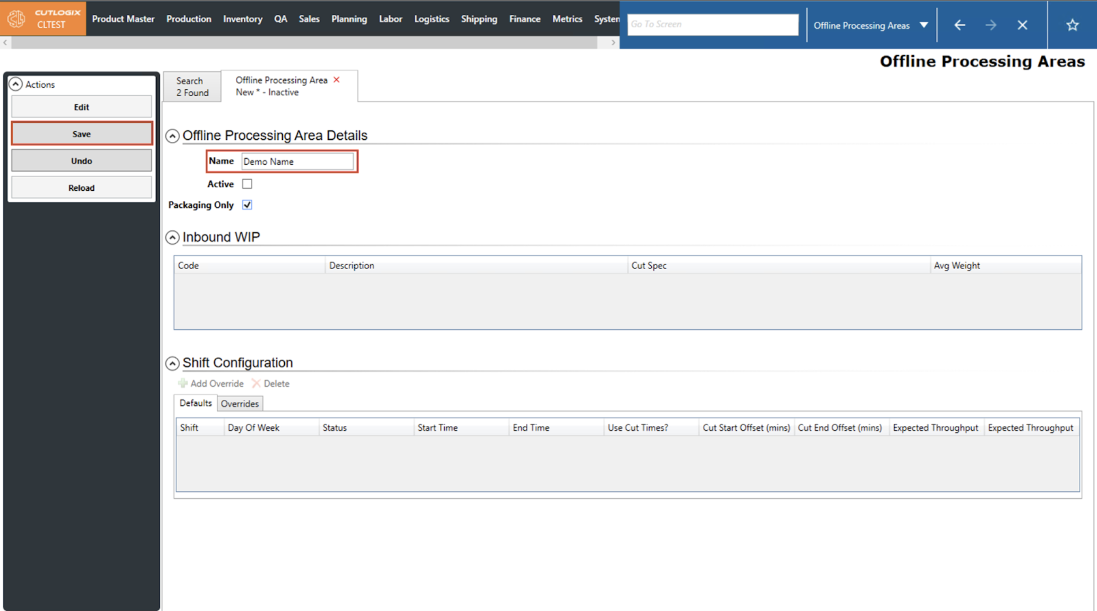 DemoStep 1: After saving a new Offline Processing Area, the default shift configs will be populated with a series of default values. If you are still on the details page after adding a new offline processing area, proceed to step 2.