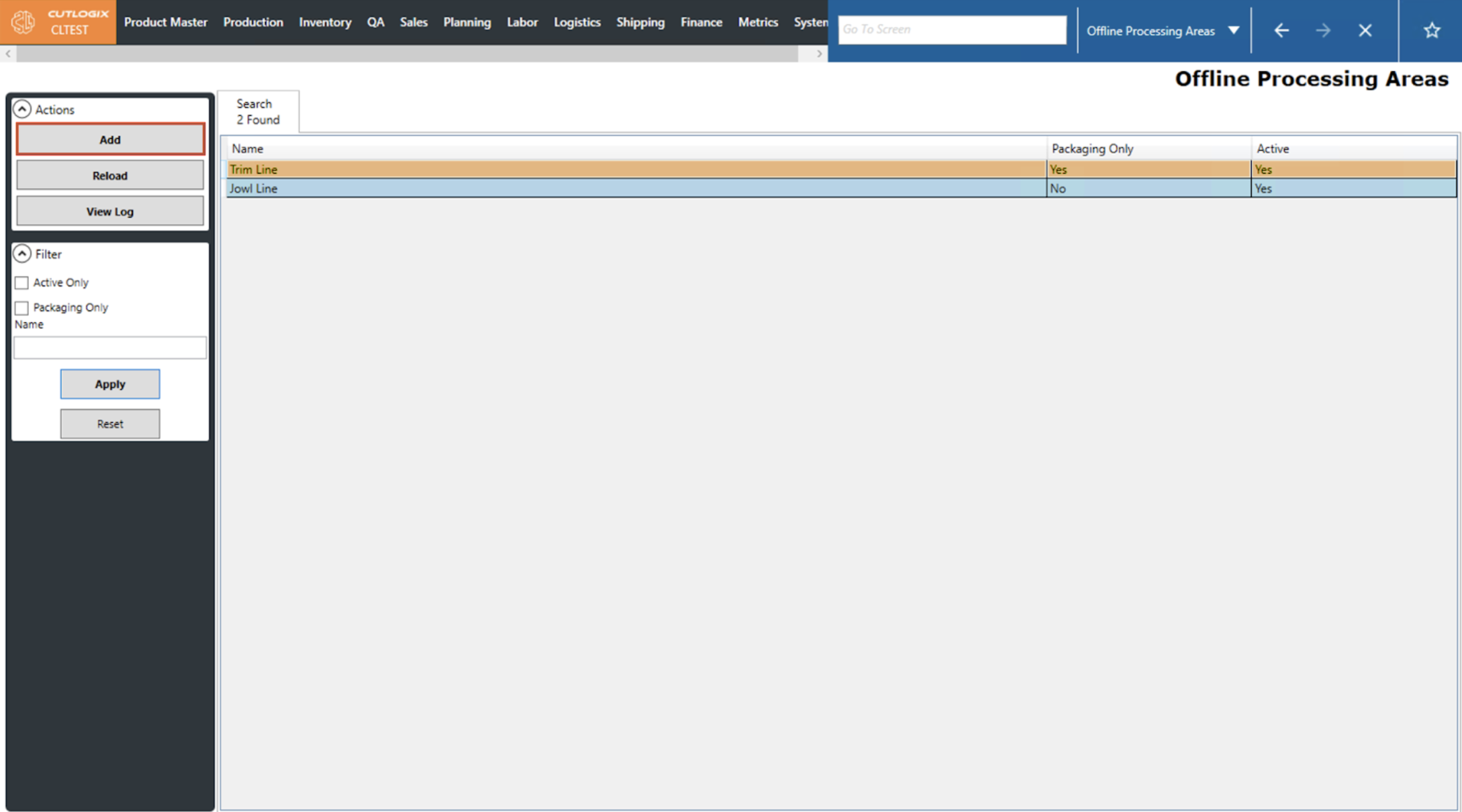 If you're not on the details page for the offline processing area, open the "Production" menu, then the "Plant Config" menu, then click on "Offline Processing Areas."