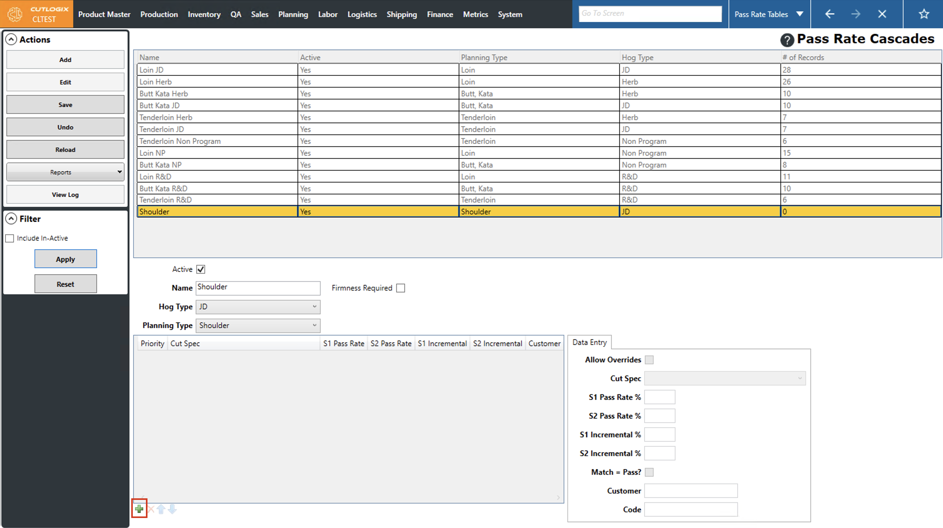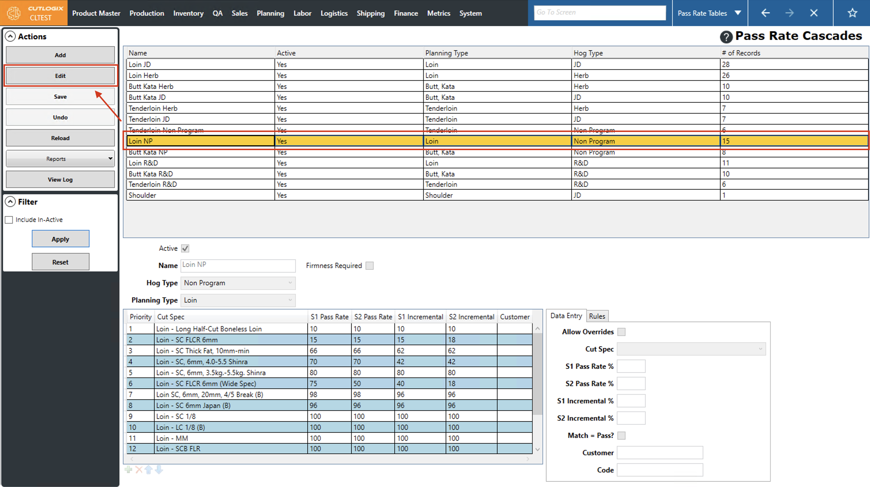 Step 3: This will enable editing at the bottom of the page for the pass rate cascade. You can edit the name and hog type for the pass rate cascade. For the records in the cascade you can click on them and use the blue up/down arrows at the bottom of the page to shift the priority of them up or down. Clicking "X" on a selected record will remove it and clicking "+" will let you add a new one to the pass rate cascade. On the right side of the page, details about the pass rate record can be edited in the "Data Entry" table and the rules that apply to the pass rate record can be modified in the "Rules" tab.