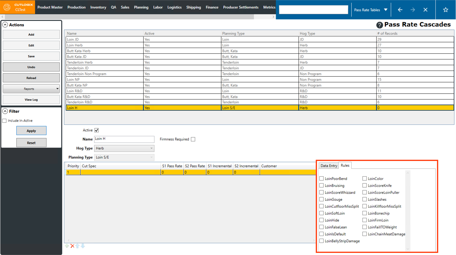 Step 6: When adding a new pass rate record for certain planning types (Ex. Loin) a “Rules” tab will be visible on the right side of the screen. On this tab, you can select the checkbox beside any rules that should apply to the pass rate record. If a cut spec matches any of the selected rules, it will not pass quality inspection for the selected pass rate record.