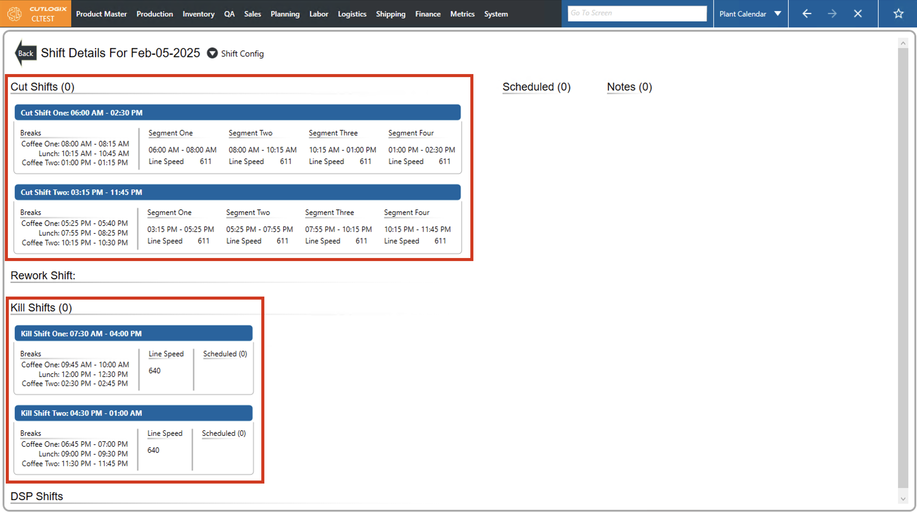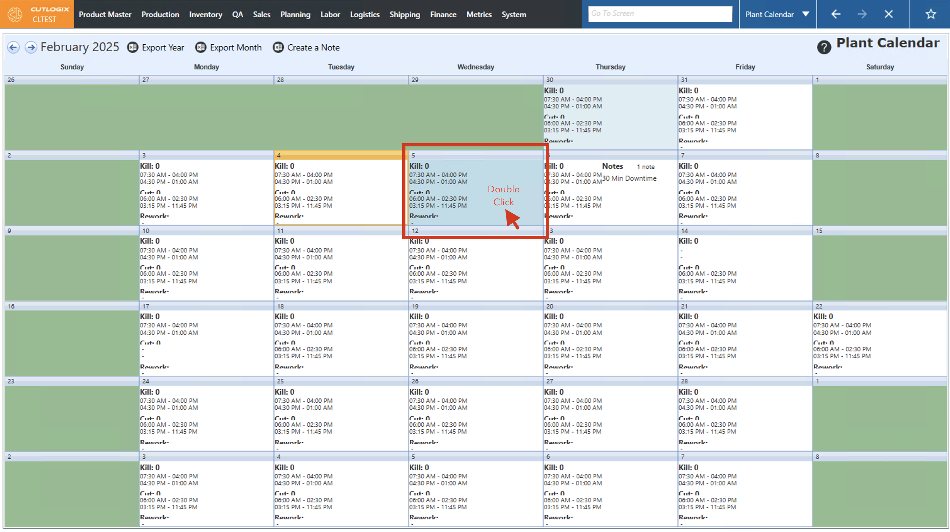 Step 3: This will open a details page with more information about the selected day. In here you can view more information about Kill and Cut Shifts, hogs scheduled for the day as well as notes (the previous section outlines how to add them).