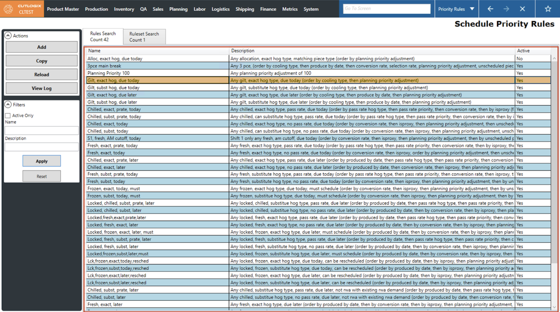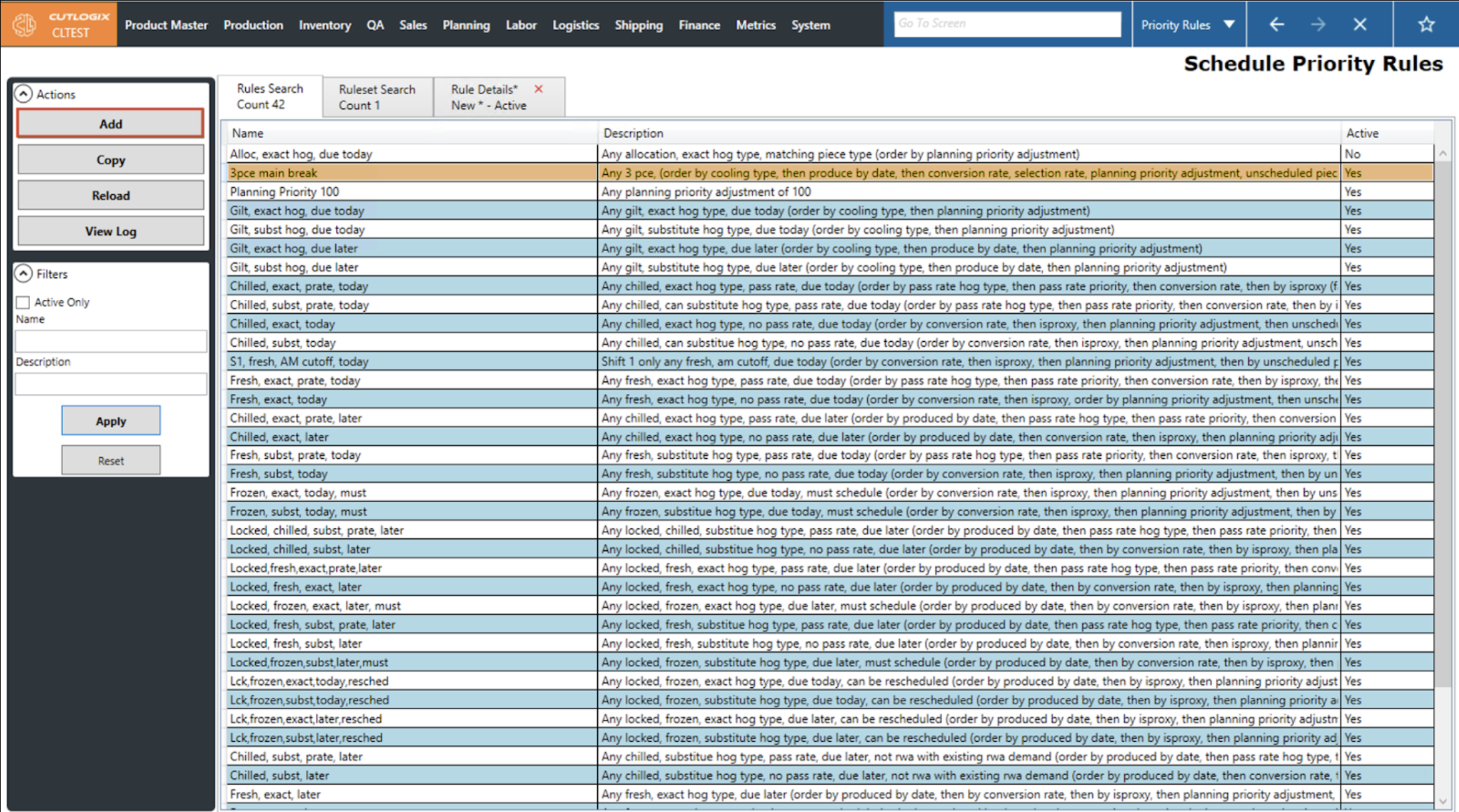 Step 4: Users can make their desired changes to the rules priority by moving them up or down with the blue arrows. They can also move rules in or out of the set by selecting them and using the green arrows. Shifting them into the Active Rules section makes them part of the rule set while shifting them out removes them from it. Lastly, users can edit the ruleset’s name and choose whether it is active. If it is active then when it is applied to schedules the planning system will use its rules. If it is inactive, the planning system will use the default hardcoded rules.
