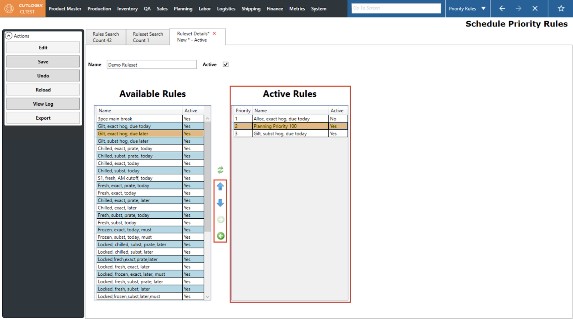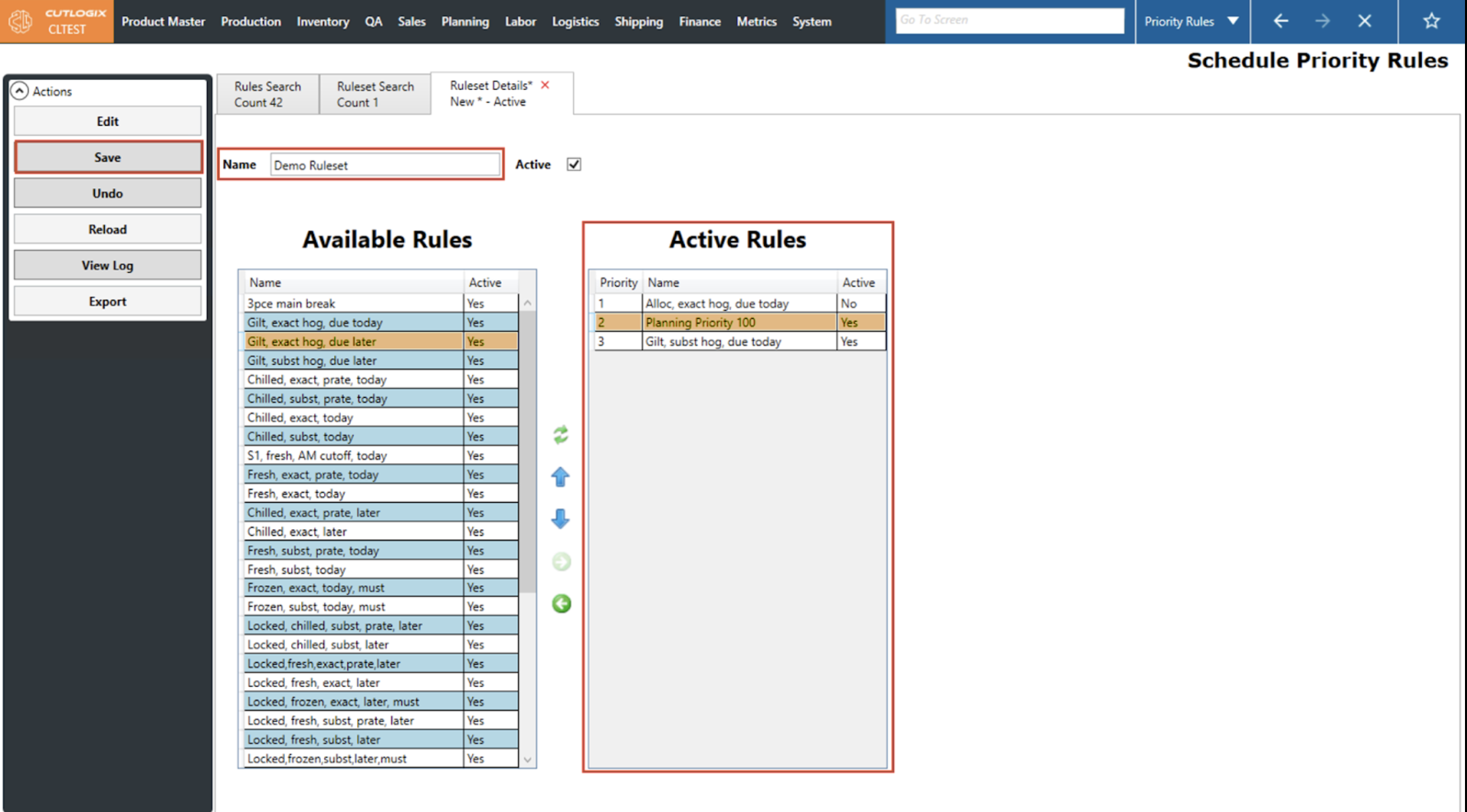 Step 3: Clicking add will open a new details tab for the new Ruleset. Users can add rules to the ruleset by using the green arrows to move them over to the Active Rules section. Users can also choose the order in which the planning system will apply these rules by moving rules up or down with the blue arrows. The planning system will apply the rules at the top of the list first before moving to those lower down.