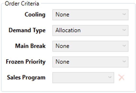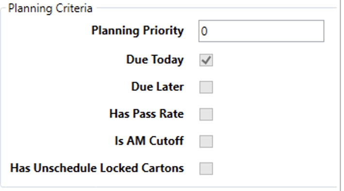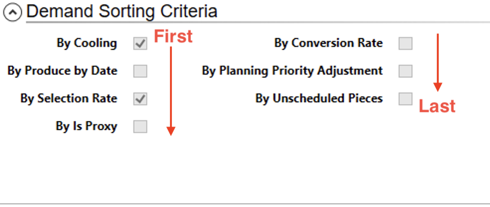 The second part of a priority rule is the sorting criteria, i.e. the criteria that helps the planning system to break ties and sort the multiple demand records that may meet the matching criteria. Checking one of the boxes tells the planning system to use that sorting criteria, unchecking tells it to ignore it. Each of these criteria are applied based on the order they appear in the list. Furthermore, each are applied in ascending order, i.e. dates go from old to new, numbers go from smallest to largest and words go into alphabetical order.