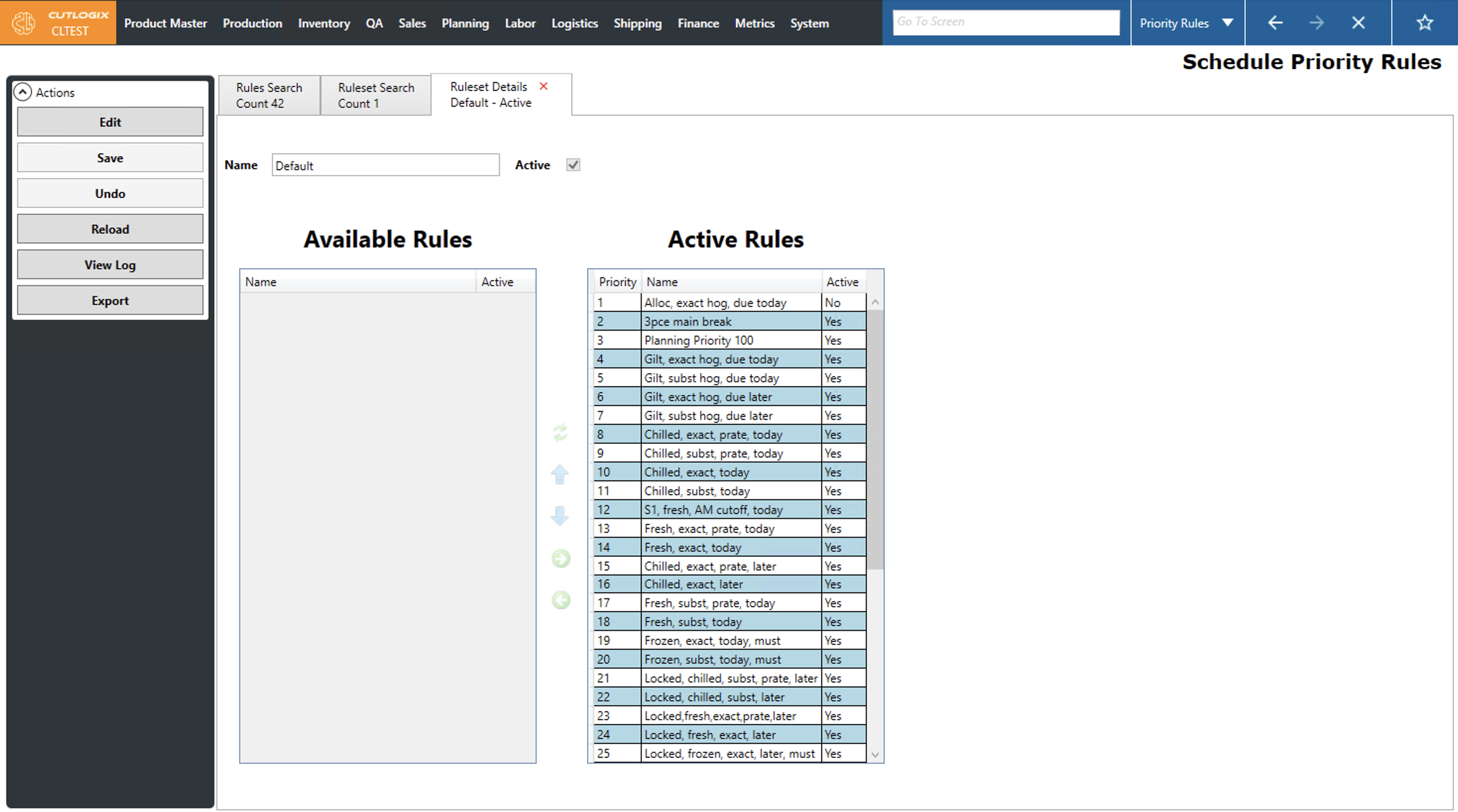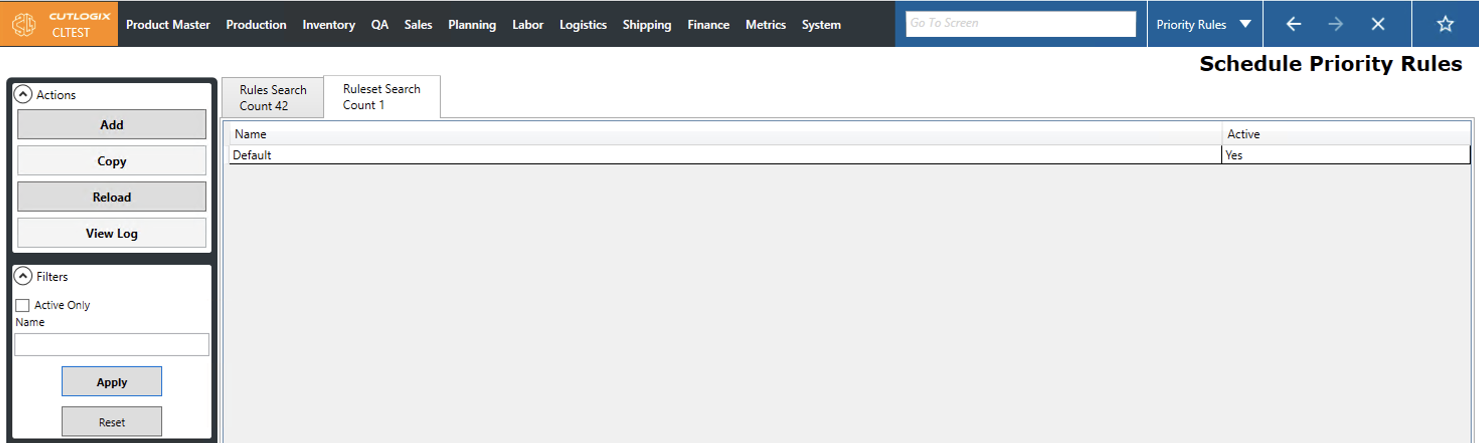 The priority rules screen provides users with a way to define rules and rulesets that will directly tell the planning system how it should make decisions when creating a production schedule. The typical workflow of this screen is that users will start on the Rules Search tab. This tab presents users with a data grid where each row is a rule. The name and description columns are both user defined fields that can be used to give a sense of what the rule does at a glance. The active column indicates whether the rule will be ignored or applied by the planning system.