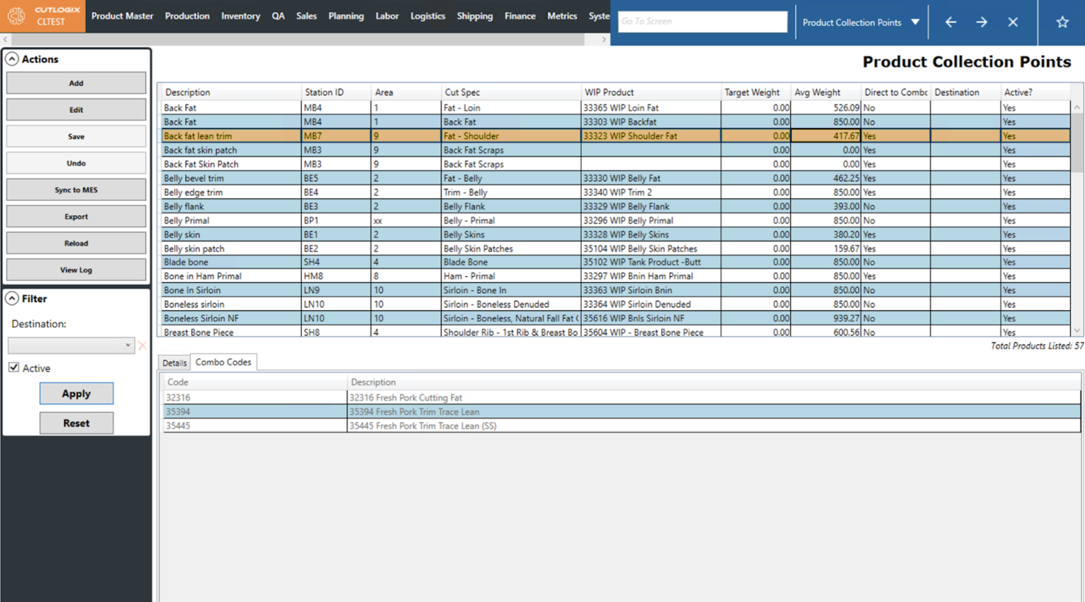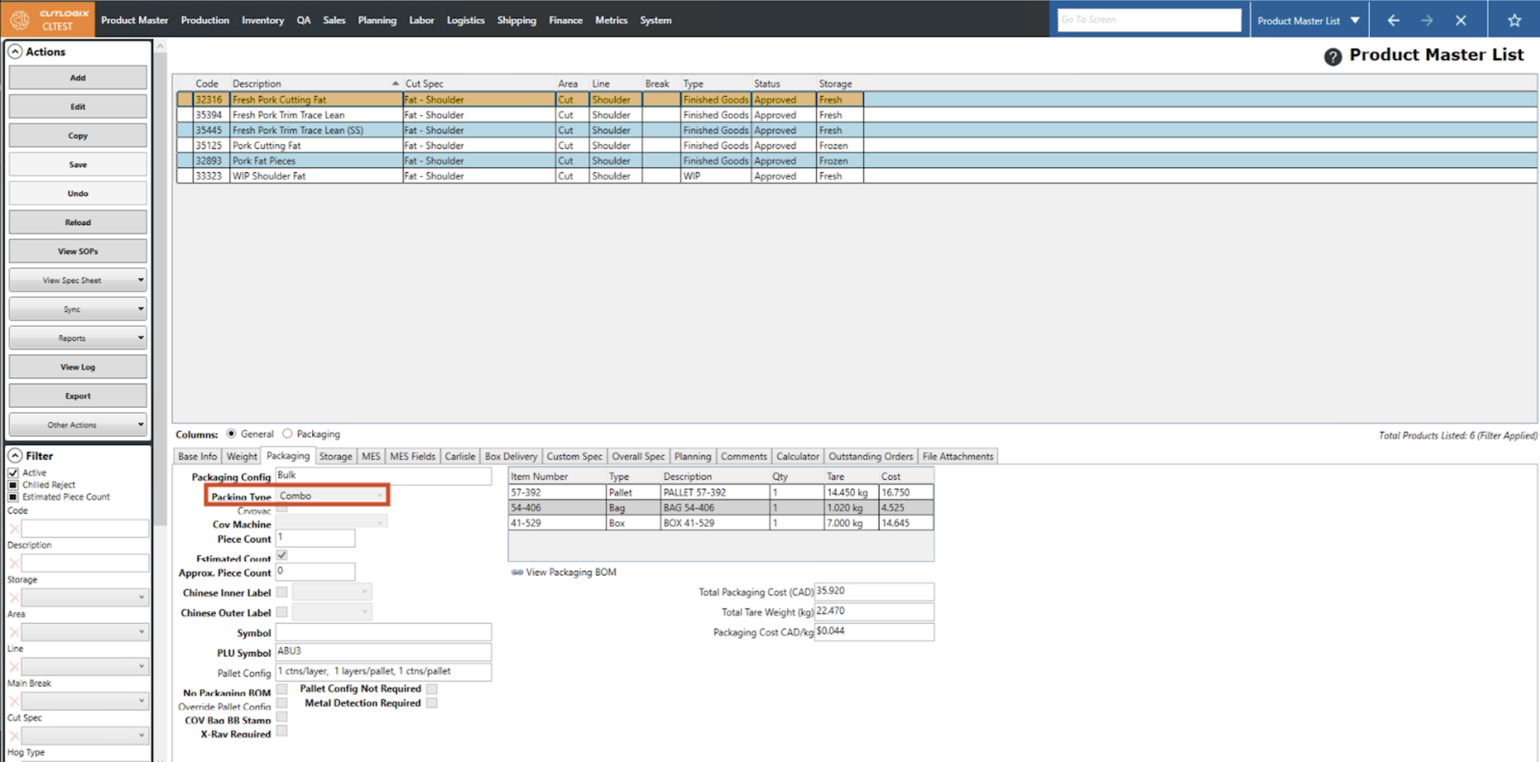 An entry will appear on the Combo Codes tab when the chosen Cut Spec for the collection point is used in a product marked as Packing Type ‘Combo’ on the Product Master > Product Master List > Packaging tab. All products that use that cut spec and are marked as the ‘Combo’ packaging type will be pulled to appear on this tab.