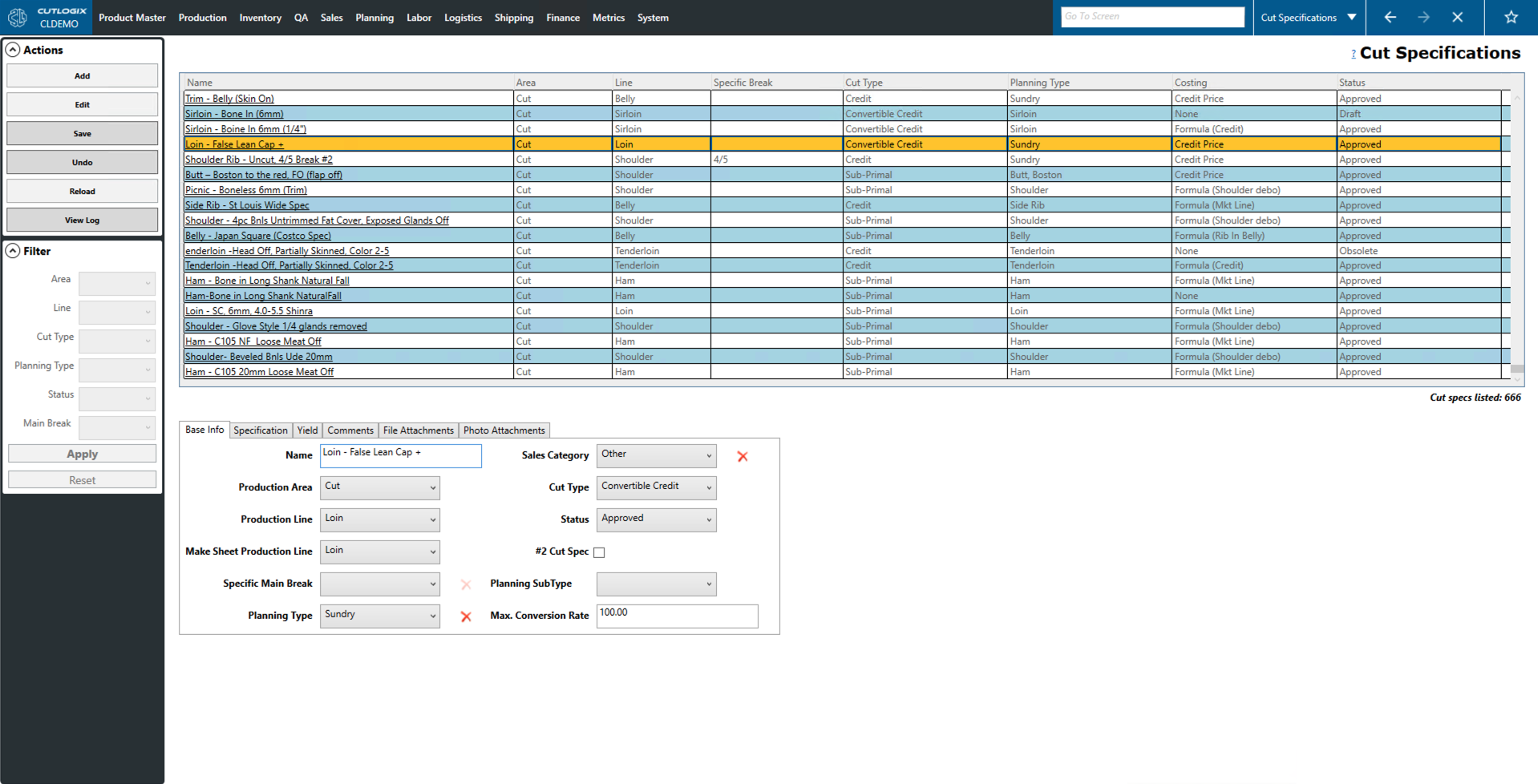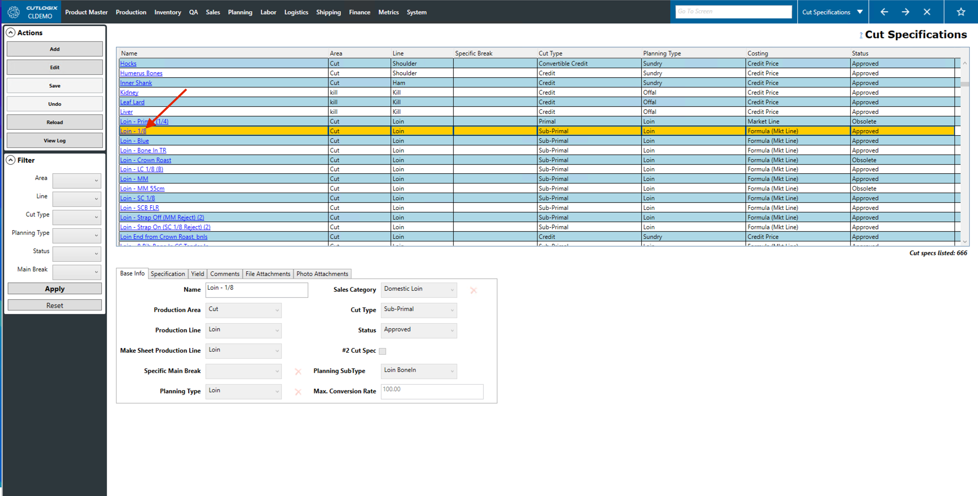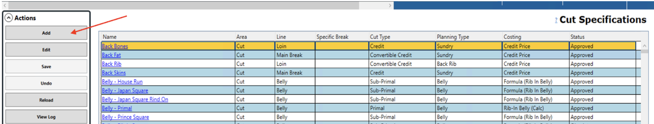 Demo Step 1: On the Cut Specification screen, in the grid, click on the link in the name (e.g. Loin ⅛)