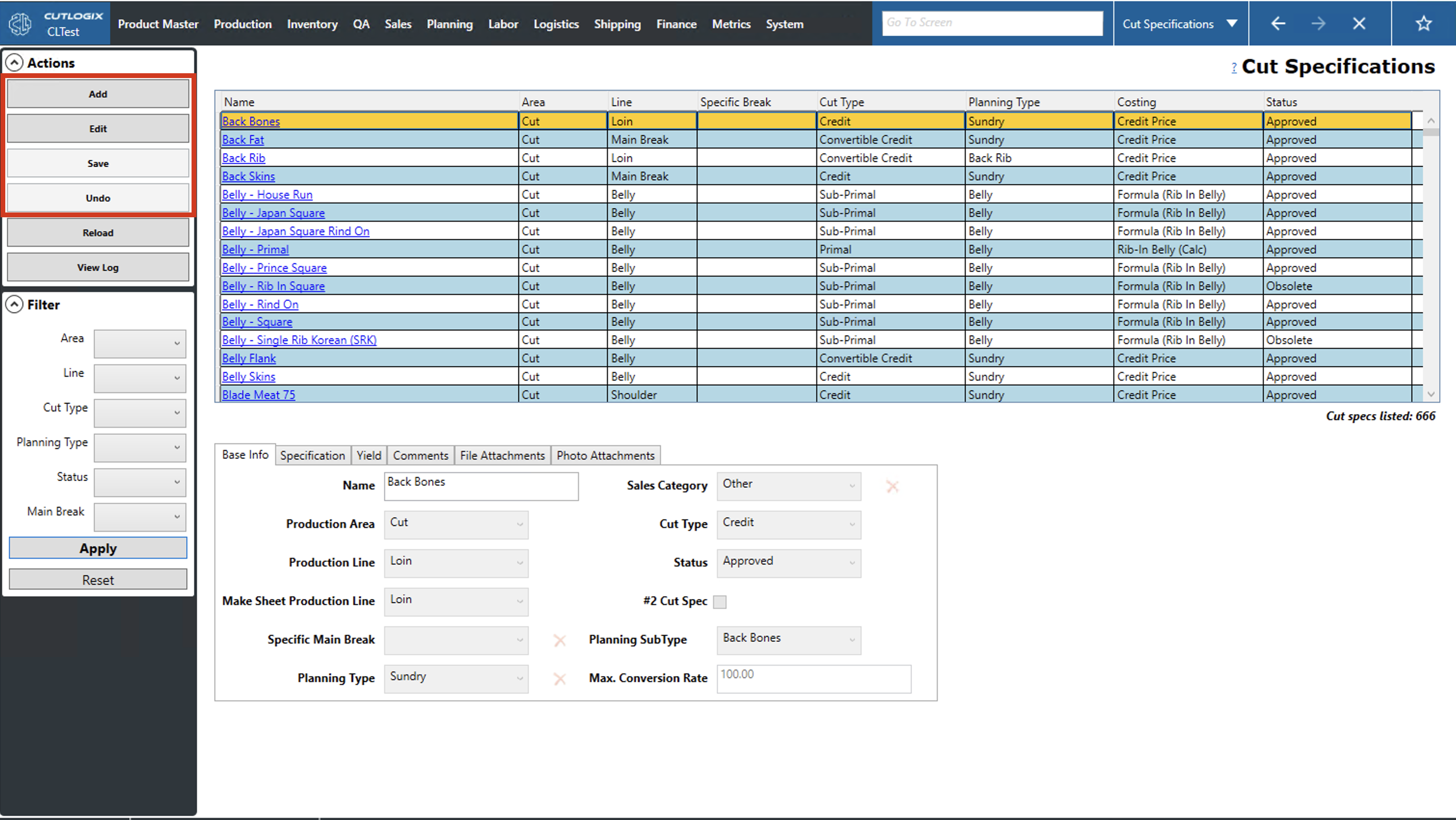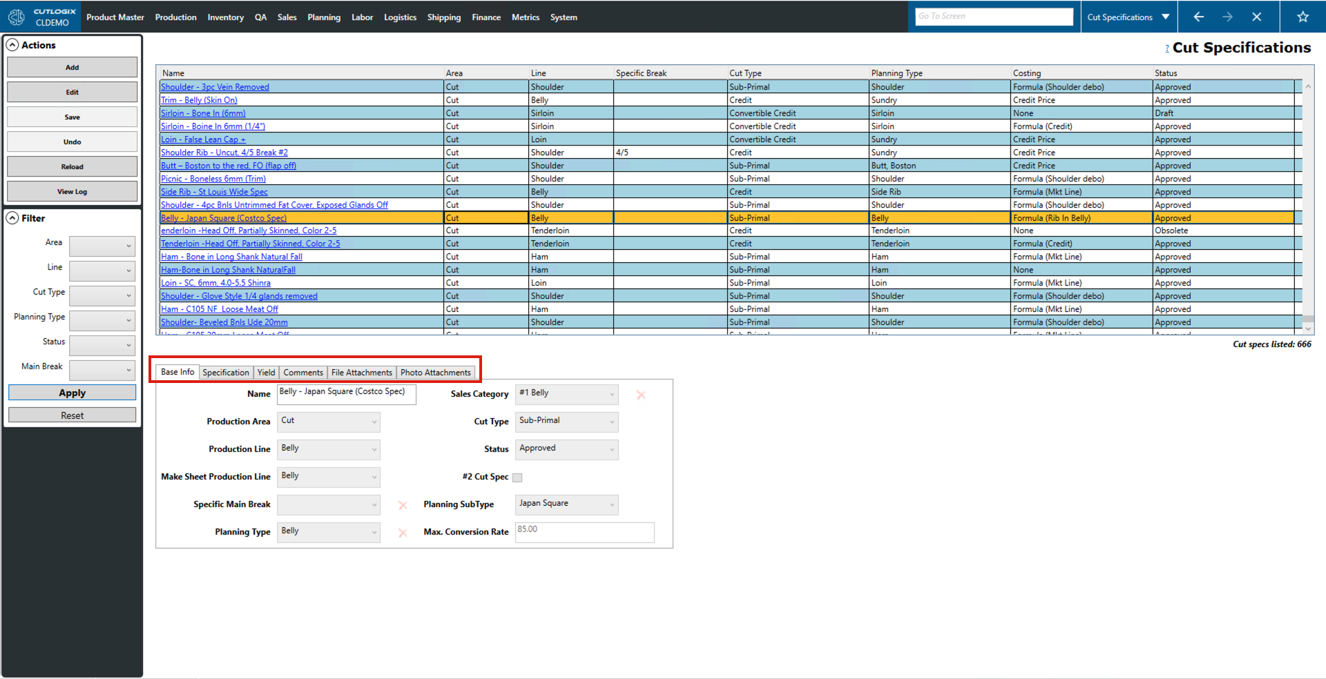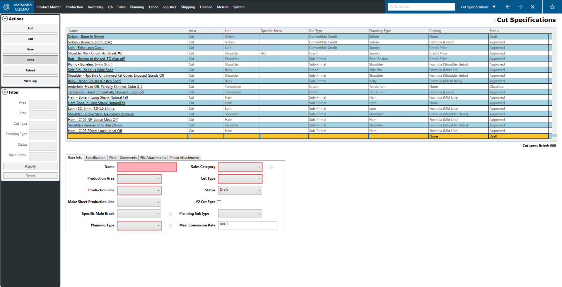 Demo Step 1: On the Cut Specification screen, in the grid, click on the link in the name (e.g. Loin ⅛)