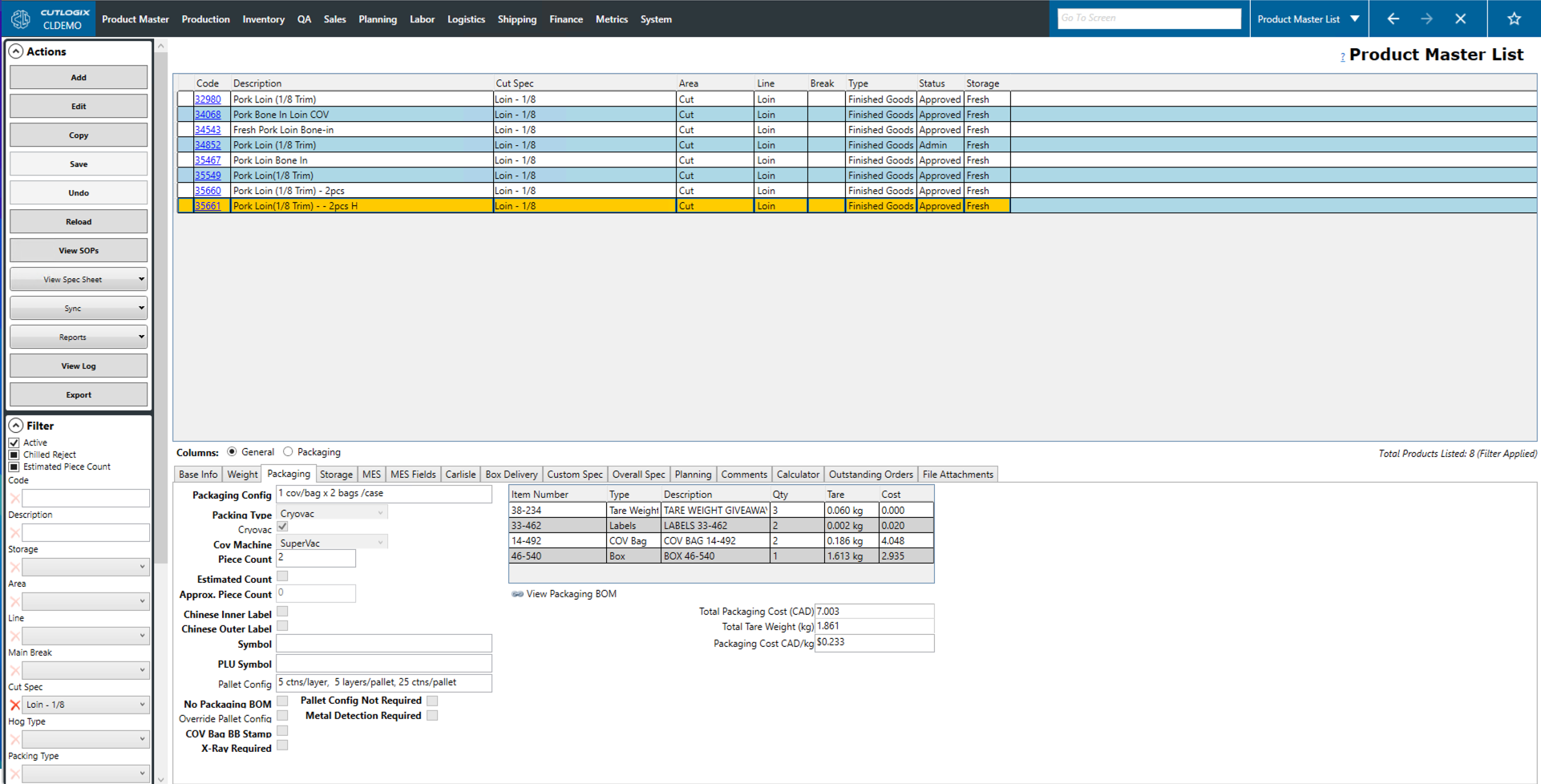 Step 2: This will bring you to the Product Master Screen showing the list of all products using this Cut Spec (in this case Cut Spec = Loin - ⅛ and all the products using this cut spec are displayed.)