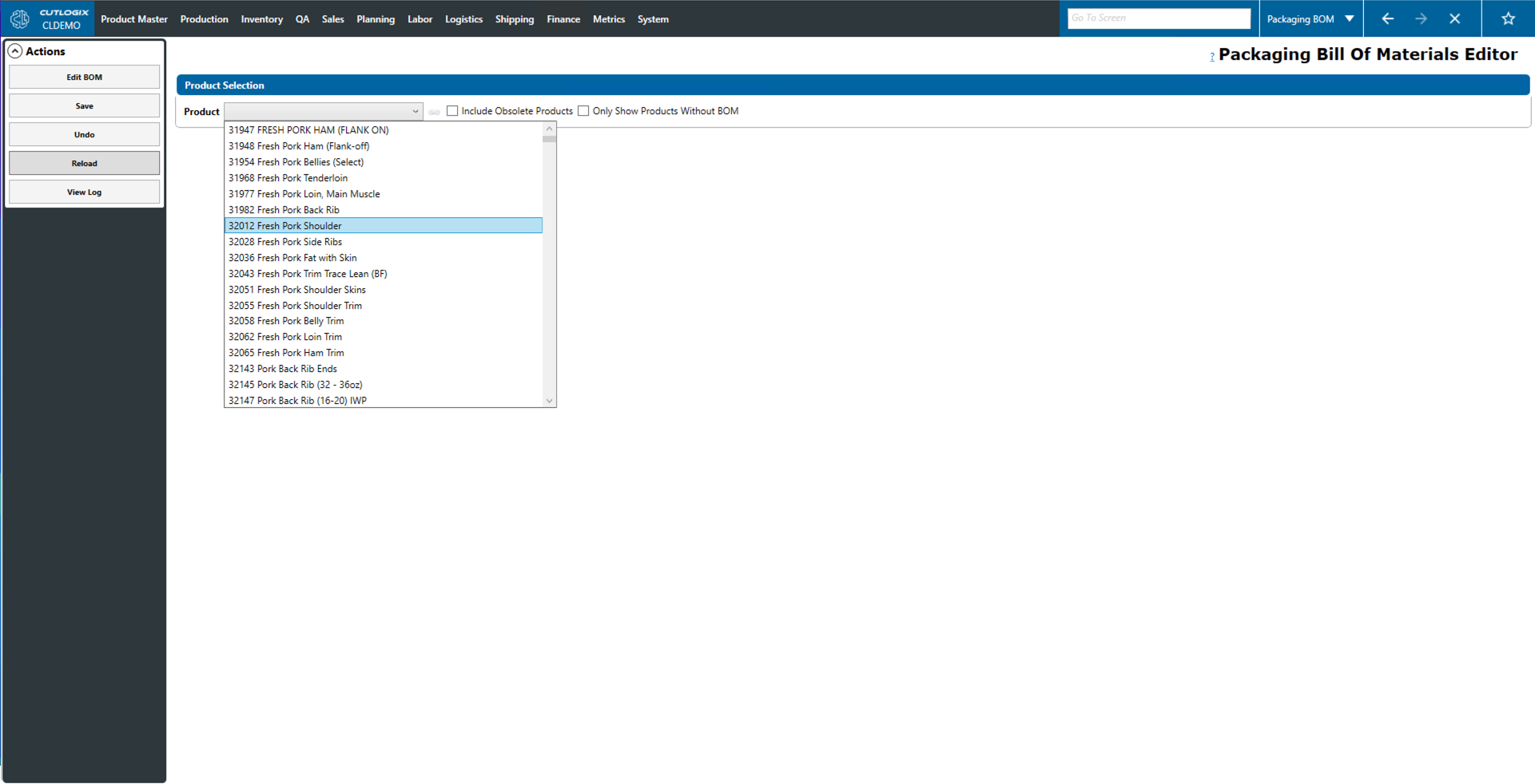 Step 1: Select a product from the "Product" dropdown menu on the "Packaging Bill Of Materials Editor" page. Once selected, the BOM for that product will appear.