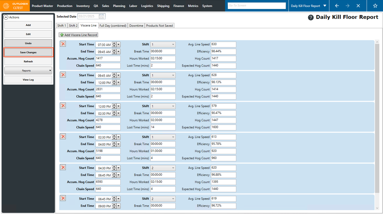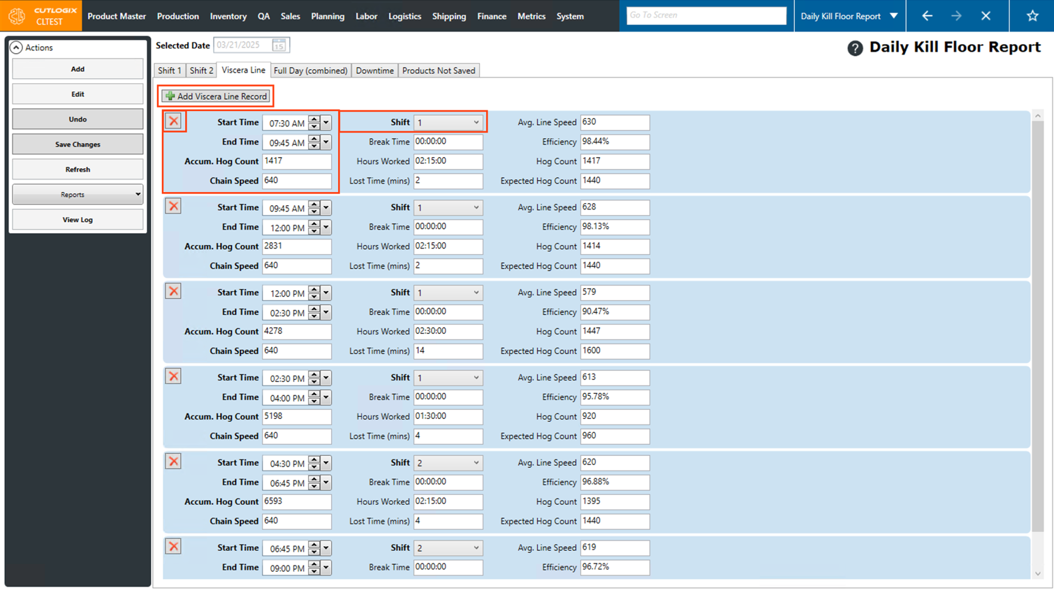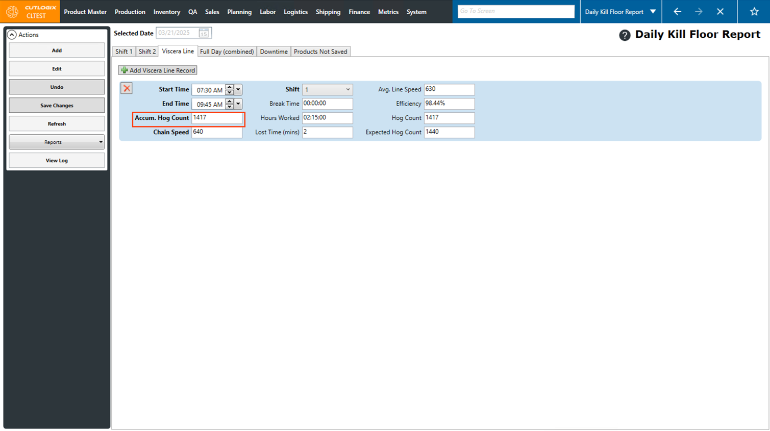 • Viscera Line: Displays each record of when the line is running throughout the day. Each record displays the start and end time, chain speed as well as the actual hog count vs the expected hog count for that time period. Typically, these records are entered manually by supervisors at break times. NOTE: "Accum. Hog Count" is a required field when entering a Viscera Line Record.
