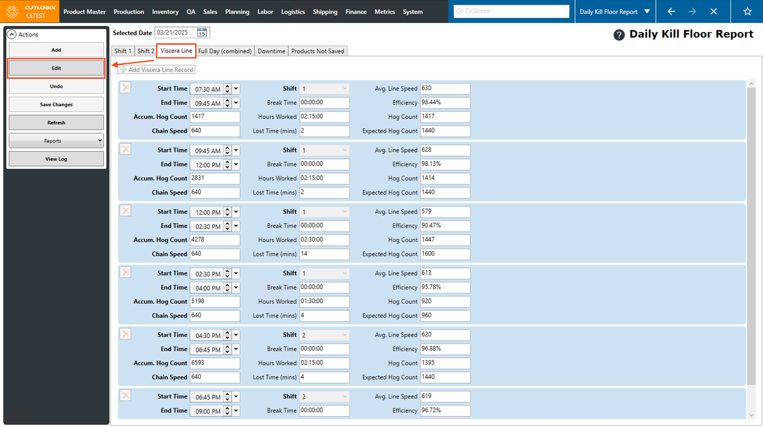 Step 4: When editing the report will be populated with that day's data. You can make changes to data in the Shift 1, Shift 2, Viscera Line, Downtime and Products Not Saved tabs.