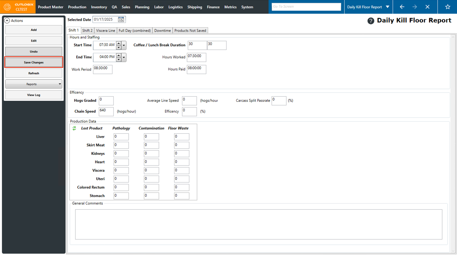 Step 6: Click "Save Changes" in the Actions panel once all the necessary information has been added for the Daily Kill Floor Report. If you don't want to save the report, clicking "Undo" in the left actions panel will discard any changes.