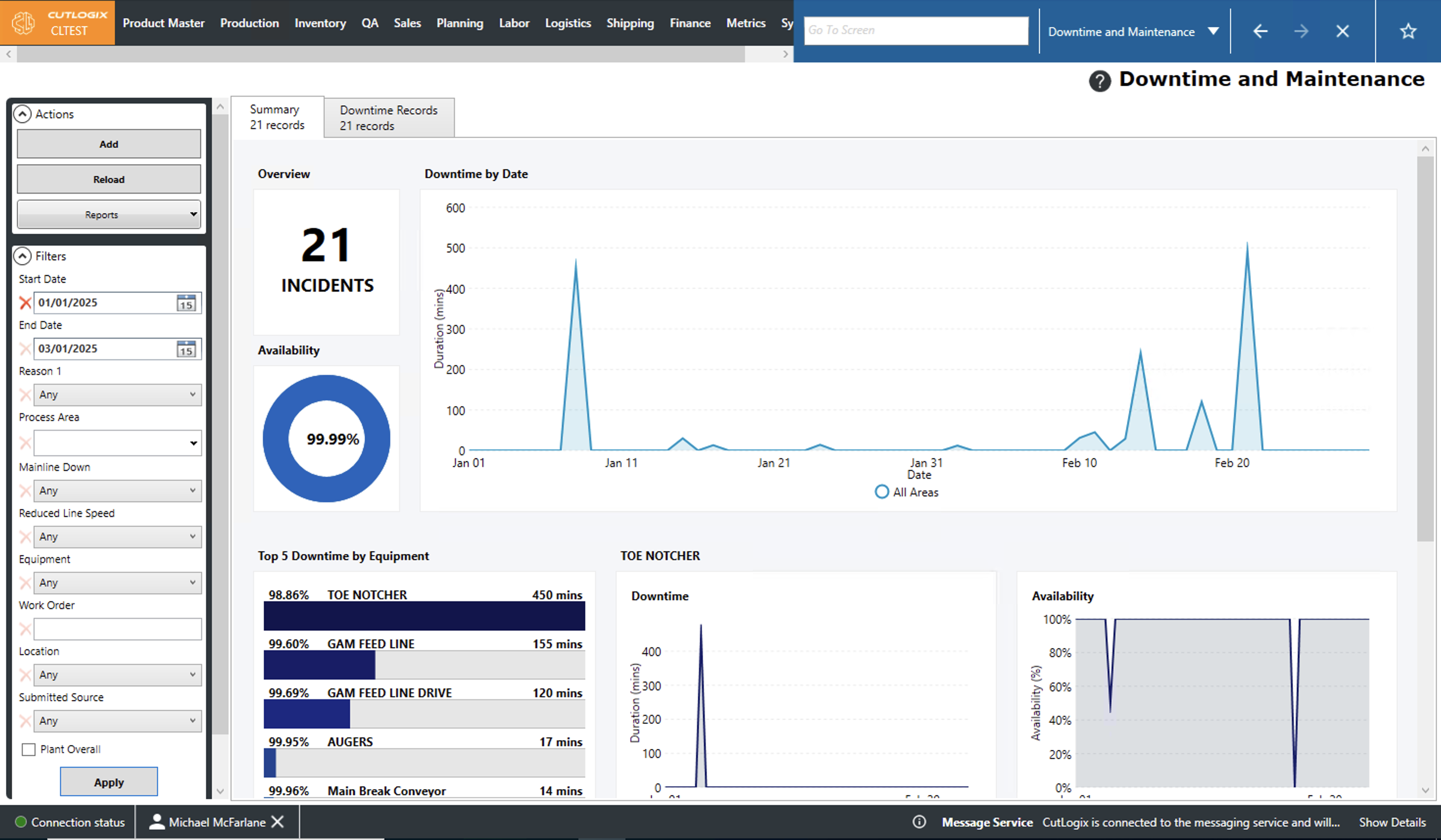Step 1: Navigate to the "Production" tab → "Downtime and Maintenance." All existing downtime records are factored into the summary page that you are taken to by default. On this page you can see data such as how many incidents took place within the selected date range (set in filters on the left side), the availability % (minutes of downtime vs how many minutes the plant was running in total), top downtime by equipment, and other metrics.