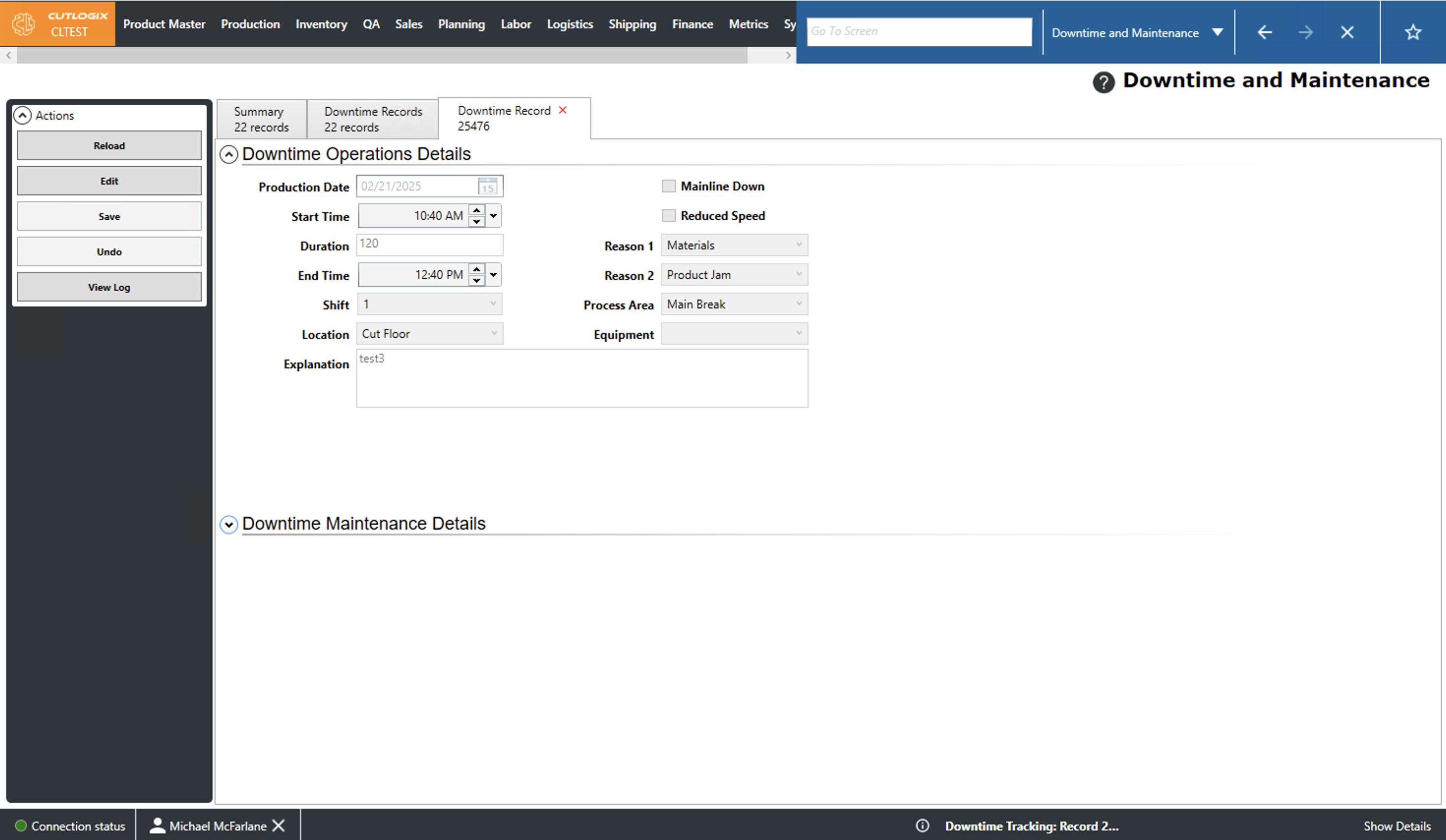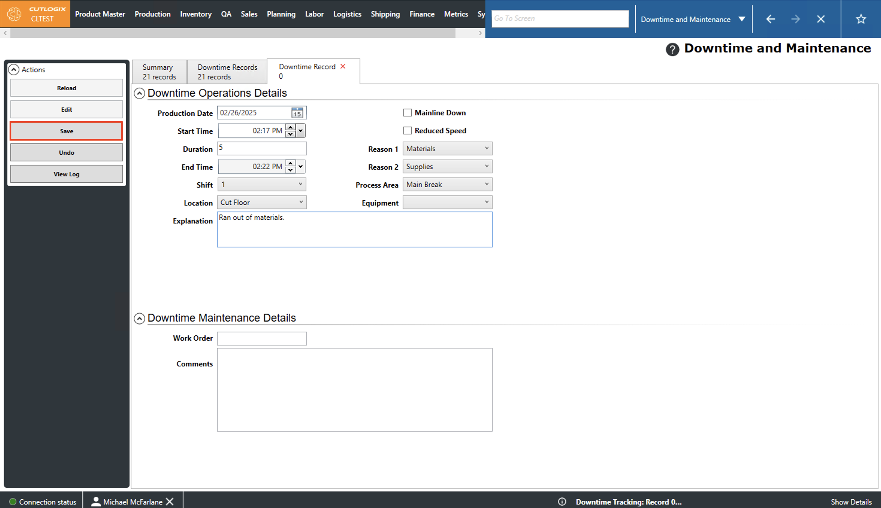 DemoStep 1: Navigate to the "Production" tab → "Downtime and Maintenance," then open the "Downtime Records" tab.
