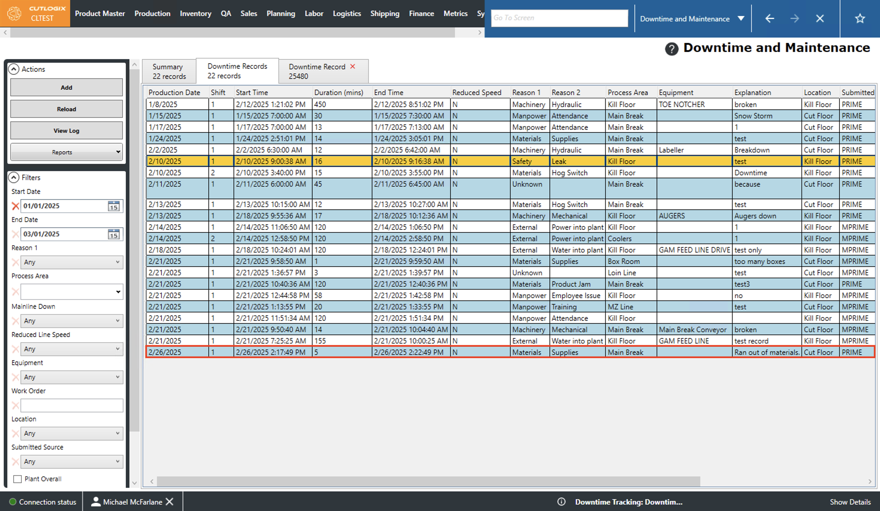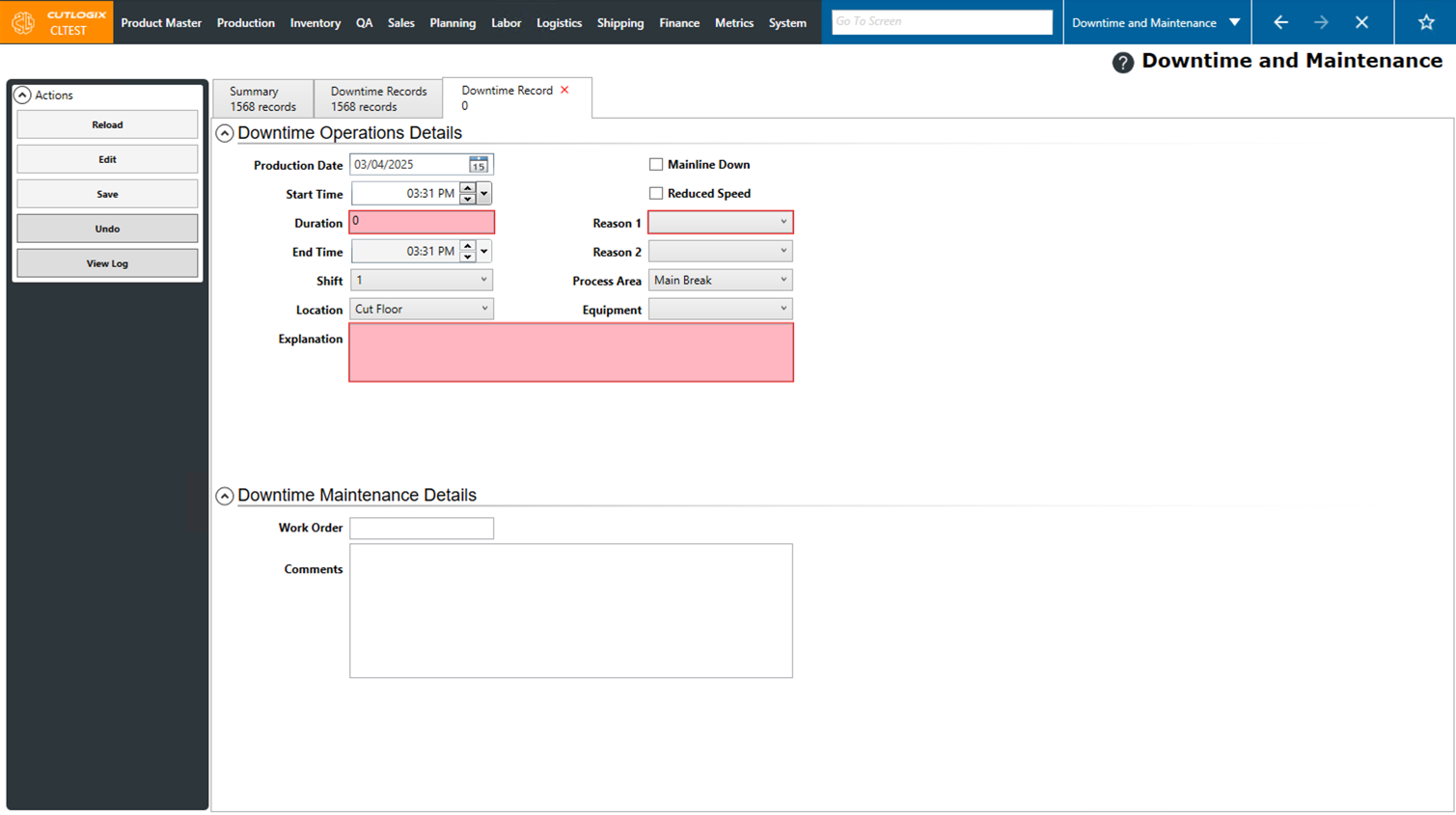 DemoNote: Downtime records can also be created from the "Daily Kill Floor Report" and "Daily Cut Floor Report" pages. Downtime records added on those pages will appear on their respective dates in the "Downtime Records" tab on the "Downtime and Maintenance" page. They are also factored into the data shown on the "Summary" tab on the "Downtime and Maintenance" page.